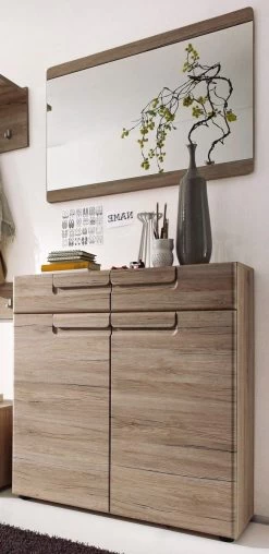 Das Garderoben Set „Malea“ 2-teilig in Eiche San Remo (90 x 188 cm) ist eine Bereicherung für Ihren Eingangsbereich. Es bietet zwei Türen und überzeugt mit zwei Schubkästen. Nutzen Sie den Platz von drei Einlegeböden. Neben der Flurkommode ist ein breiter Spiegel im Set enthalten. Dank der unempfindlichen Beschaffenheit werden Sie lange Freude an dieser Garderobenkombination haben. Das Modell „Malea“ wurde aus FSC®-zertifiziertem Material aus nachhaltiger Forstwirtschaft hergestellt. Das 2er Set in der Farbe San Remo Eiche Dekor bereichert Ihr persönliches Einrichtungskonzept durch das natürliche, moderne Design zusätzlich. Es nimmt insgesamt 35,0 x 188,0 x 90,0 cm ein und kann in anderen Größenausführungen gewählt werden. Die 2-teilige Garderobe von Trendteam ist ein absoluter Gewinn für alle Liebhaber hübscher Flureinrichtung.