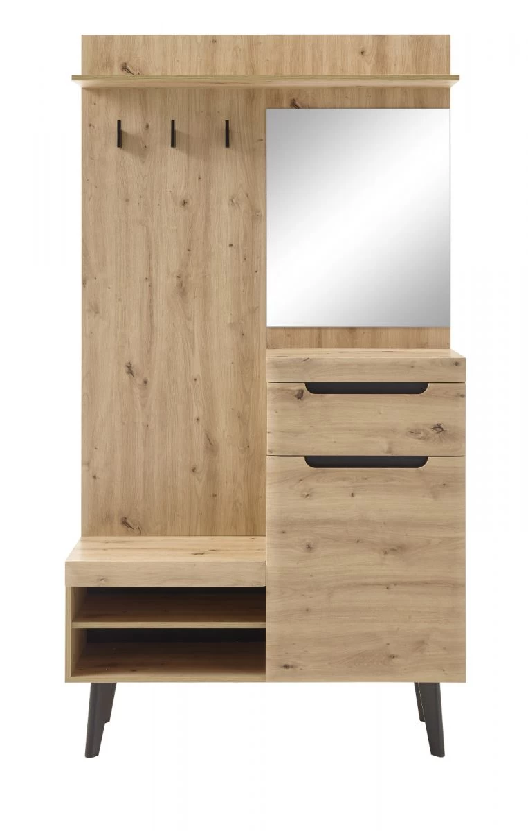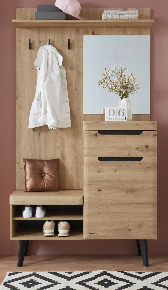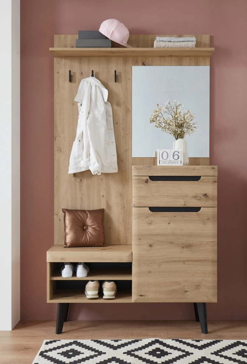 Sie müssen mit dieser Garderobe nicht mehr darüber nachdenken, wo Sie Ihre Kleidung am besten unterbringen sollten. Das Modell „Ronson“ in Artisan Eiche und schwarz (110 x 200 cm) besitzt zwei offene Ablagefächer, einen Spiegel und drei Kleiderhaken als eingebaute Extras. Die Kompaktgarderobe hat einen Schubkasten und erweitert mit ihrer Tür Ihren Stauraum. Sie ist für Ihren kleinen Eingangsbereich ausgezeichnet geeignet. Dank einer Hutablage sowie eines Einlegebodens entsteht Platz zum ordentlichen Einräumen. Dank der unempfindlichen Beschaffenheit werden Sie viel Freude an diesem Flurmöbel haben. Das Modell „Ronson“ kann auch optisch durch sein modernes, skandinavisches Design begeistern. Die im Dekor Artisan Eiche und in der Farbe Schwarz gehaltene Garderobe besteht aus FSC®-zertifiziertem Material. Die grifflose Front sorgt für einen attraktiven Gesamteindruck. Das Modell „Ronson“ weist eine Breite von 110 cm, eine Höhe von 200 cm sowie eine Tiefe von 34 cm auf. Darüber hinaus steht es in verschiedenen Ausführungen zur Verfügung. Diese Kompaktgarderobe ist die perfekte Lösung für kleine Flure.