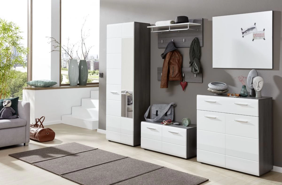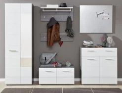 Das Set setzt sich aus einem Flurschrank, einem Garderobenpaneel, einer Garderobenleiste, einer Sitzbank, einem Garderobenspiegel und einem Schuhschrank zusammen. Unterschiedlichste Dinge wie Jacken, Mäntel, Mützen und Schals finden in den geräumigen Fächern oder an der Kleiderstange einen aufgeräumten Platz. Die Oberflächen sind pflegeleicht, bei Bedarf einfach mit einem leicht feuchten Tuch abwischen.
