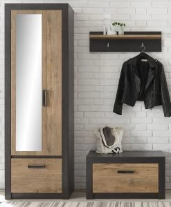 Sie fällt durch ihre attraktive Rahmenoptik und ihre rustikalen Holztöne auf. Je nach vorhandenem Raumkonzept lassen sich die Garderobenmöbel individuell platzieren. In dem Set enthalten ist ein Garderobenschrank, ein Paneel und eine Garderobenbank, die viel Platz für Jacken, Schuhe und andere Dinge bieten. Bei der Fertigung kommt FSC®-zertifizierter Holzwerkstoff zum Einsatz. Ein zusätzlicher Pluspunkt sind die pflegeleichten Oberflächen.