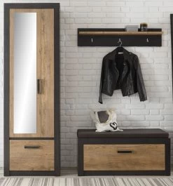 Das 4-teilige Set setzt sich aus einem Garderobenschrank, einem Paneel, einer Garderobenbank und dem passeneden Sitzkissen zusammen. Optisch überzeugen die Garderobenmöbel mit ihrer natürlichen Holzoptik in Kombination mit zurückhaltendem grau. Neben dem optischen Mehrwert erweist sich der
