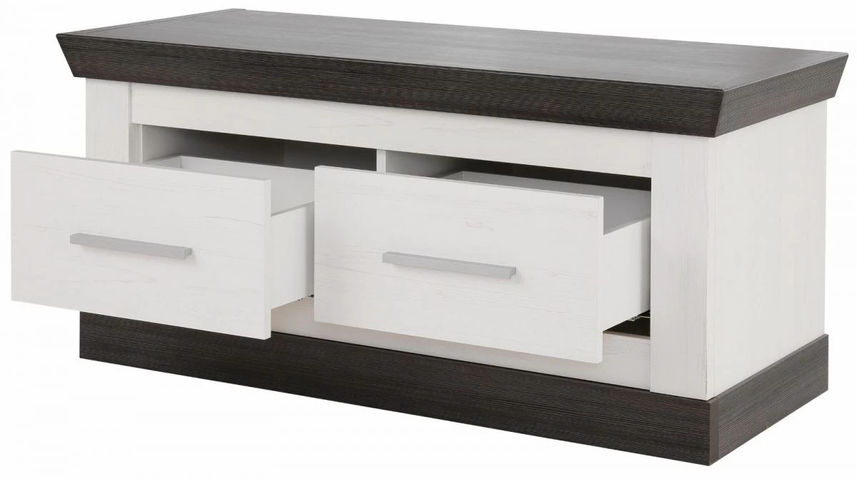 Für den Flur sind die Garderobenmöbel bestehend aus Garderobenschrank, Wandpaneel und Sitzbank mit Sitzkissen die ideale Lösung. Die Möbel mit dekorativen farblichen Absetzungen lassen sich auf verschiedene Weise kombinieren. Viel Stauraum findet sich im Innenraum des Garderobenschranks, dort können Jacken, Mäntel, Schuhe und vieles mehr ordentlich verstaut werden. Das Garderobenpaneel bietet zudem eine Hutablage. Die Griffe, Haken und Kleiderstangen bestehen aus Metall, Türen und Schubladen sind mit einer Soft-Close-Funktion ausgestattet. Wohnlichkeit mit Design und Funktion ermöglicht das geschmackvolle Garderoben-Set.