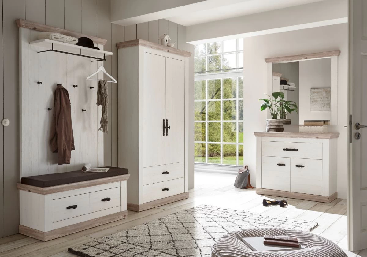 Für ein rustikales Flair im Landhausstil sorgen die Garderobenmöbel „Rovola“.