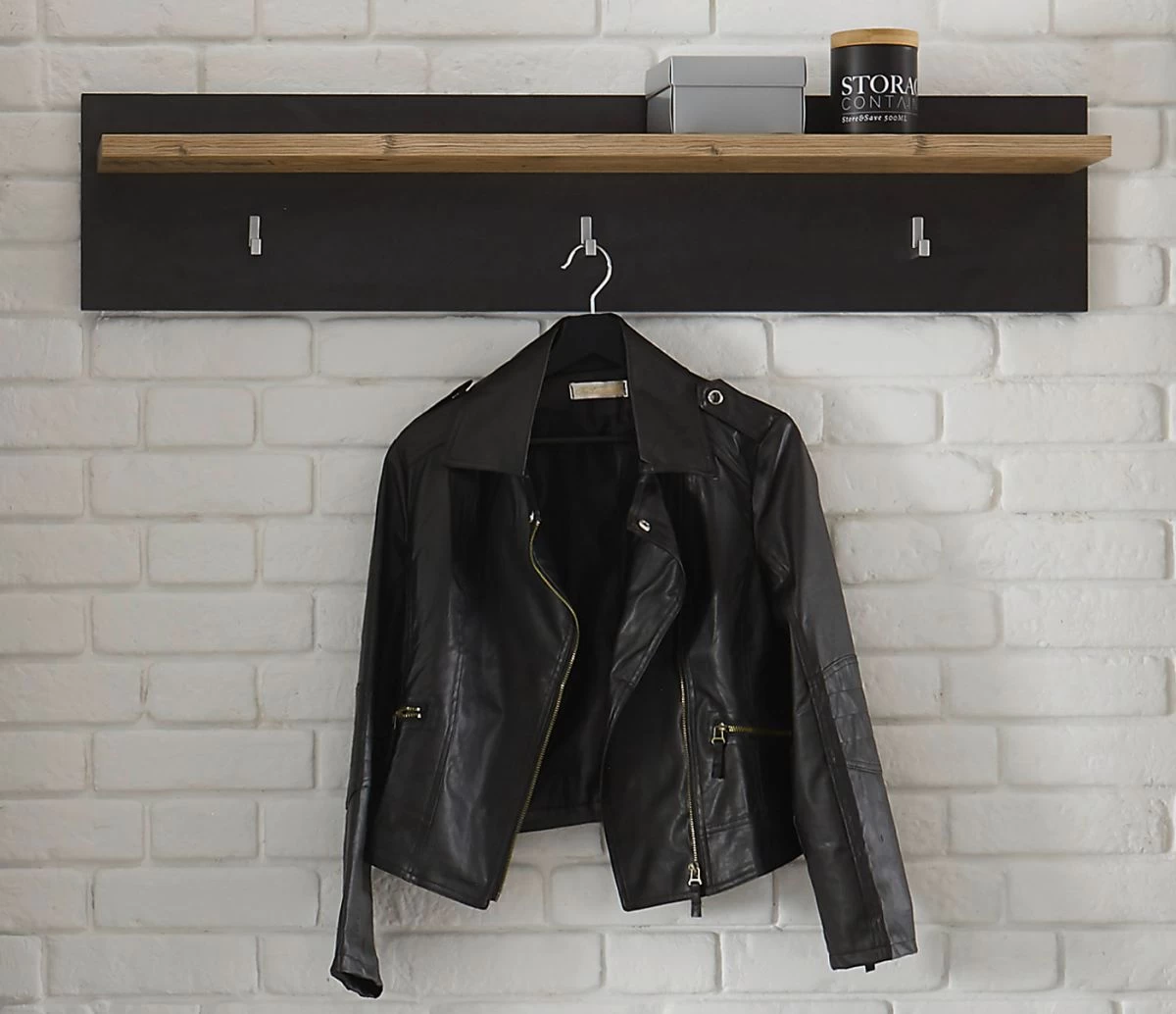 In puncto Aufbewahrung auf kleinstem Raum ist diese Wandgarderobe Ihre Lösung. Das Modell „Beveren“ in Kastanie Dekor und Fresco grau (107 x 23 cm) findet in Ihrem Eingangsbereich seinen perfekten Platz. Es ist mit drei Kleiderhaken und einer Hutablage ausgestattet. Durch die herausragende Materialauswahl ist das stabile Garderobenpaneel unempfindlich und besonders widerstandsfähig. Ihr persönliches Einrichtungskonzept wird dank des modernen Stils ergänzt. Die kompakte Garderobe in Fresco Grau und im Dekor Kastanie weist eine Gesamthöhe von 23 cm, eine Breite von 107 cm sowie eine Tiefe von 18 cm auf. Mit diesem Garderobenpaneel schaffen Sie zusätzliche Unterbringungsmöglichkeiten für Mäntel, Taschen und Mützen.