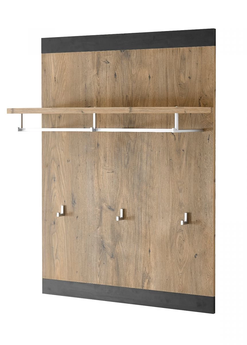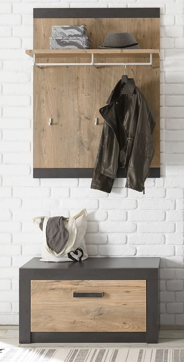 Es überzeugt durch seine attraktive Holzoptik und die klare Formensprache, die zu vielen Einrichtungsstilen passt. Die Wandgarderobe ist mit einer Kleiderstange für Jacken und Mäntel und einer großzügigen Hutablage ausgestattet. Zudem bietet sie mehrere Haken am Paneel für Taschen und Schals. Dank der geringen Tiefe ist die Flurgarderobe auch für kleinere Räume die passende Wahl.