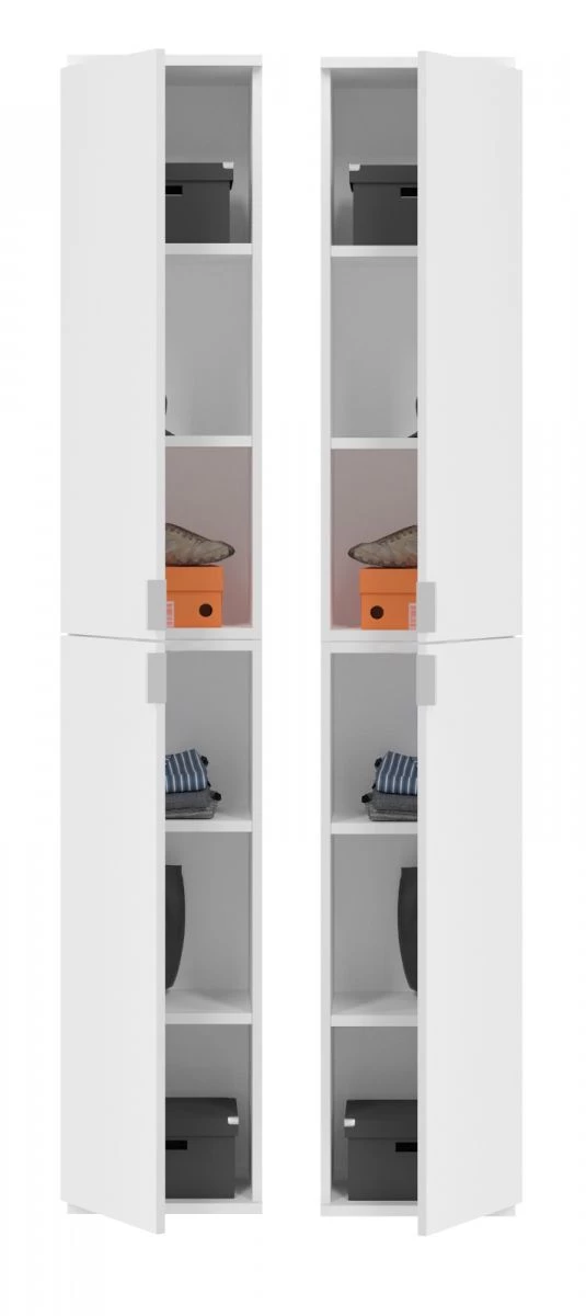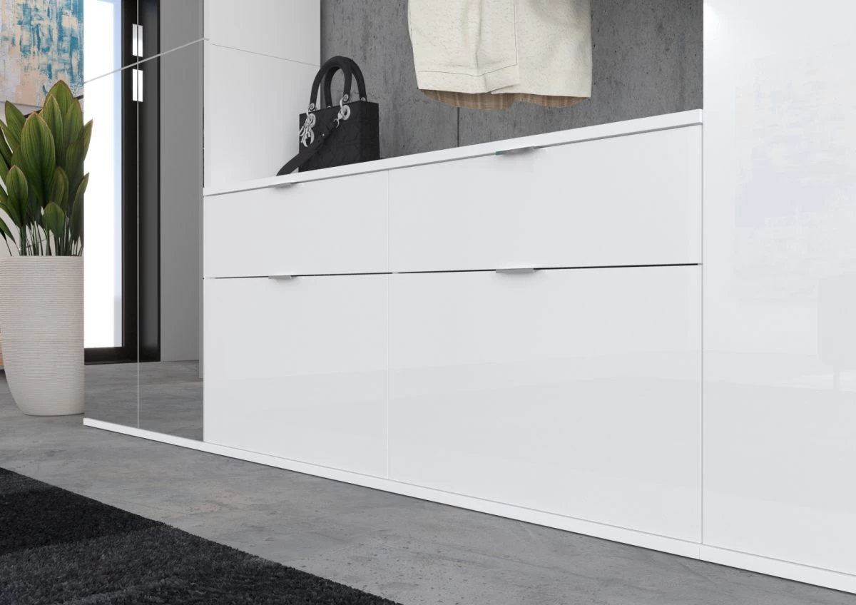 Die Systemmöbel „ProjektX“ von Xonox lassen sich ganz nach Ihren Vorstellungen zu einer individuellen Flureinrichtung kombinieren. Der Garderobenschrank im modernen und zeitlosen Design hat eine Front komplett in weiß Hochglanz. Der Korpus ist im Dekor Weiß gehalten. Die Garderobenschrank-Lösung setzt sich aus zwei Schrank-Elementen, einer Kommode sowie einer offenen Nische mit Kleiderstange zusammen. Insgesamt verfügt das Flurmöbel über sechs Türen, 15 Einlege- und zwei Konstruktionsböden, zwei Schubkästen, zwei Klappen und eine weitere ausziehbare Kleiderstange. Damit stehen Ihnen 21 geschlossene Fächer zur ordentlichen Aufbewahrung Ihrer Bekleidung zur Verfügung. Der Garderobenschrank hat eine Breite von 212 cm, eine Höhe von 193 cm und eine Tiefe von 34 cm. Diesen Mehrzweckschrank können Sie frei mit den Kommoden aus dem Systemmöbel-Programm „ProjektX“ vom Hersteller Xonox zu einer individuellen Flureinrichtung kombinieren.