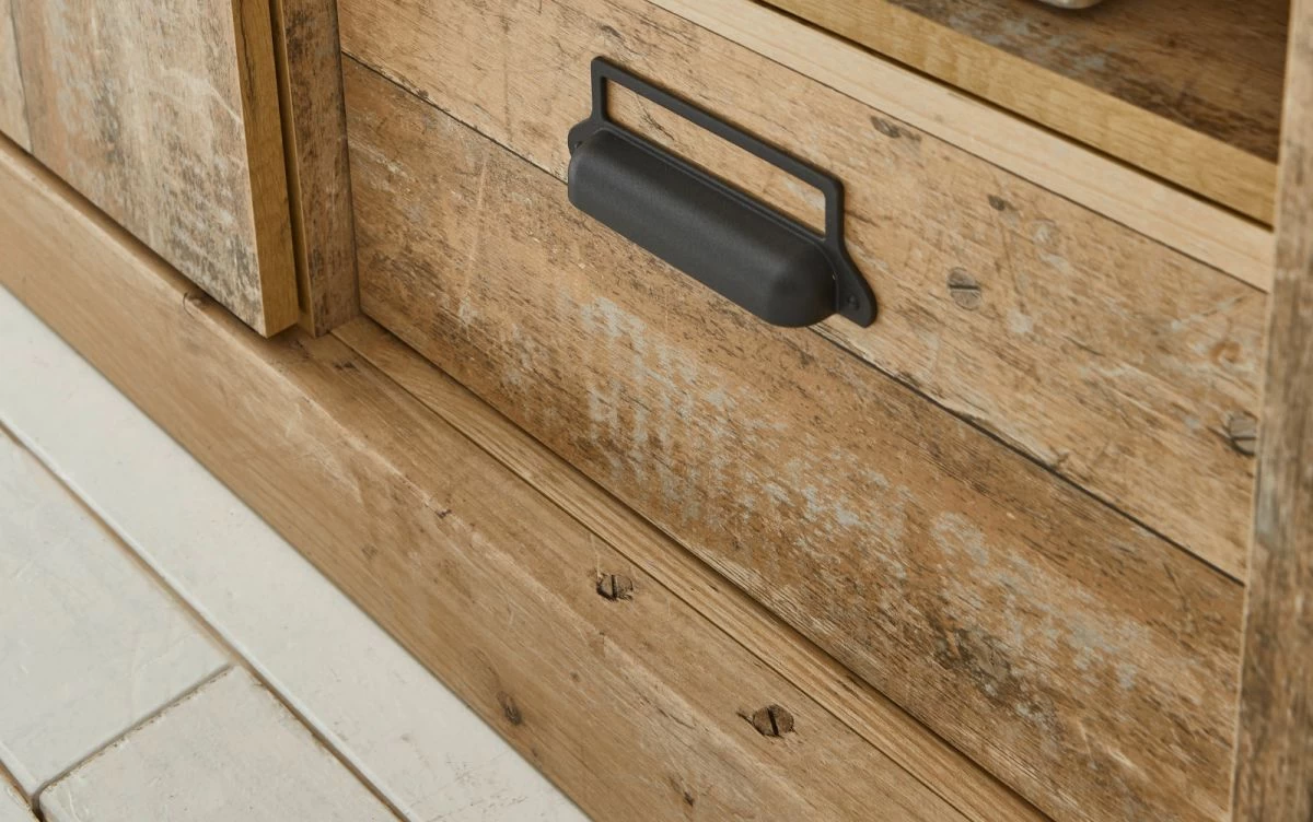 Diese Kommode sorgt für bewundernde Blicke. Das Modell „Stove“ in Used Wood hell und anthrazit (93 x 91 cm) ist eine wahre Bereicherung für jedes Ess- und Wohnzimmer und besticht mit einer Schiebetür, hinter der Ihr Hab und Gut untergebracht werden kann. Das Möbelstück überzeugt mit einer praktischen Soft-Close-Funktion. Es ist mit drei Schubladen und zwei Einlegeböden ausgestattet. Die Kommode besteht aus FSC®-zertifiziertem Material aus nachhaltig bewirtschafteten Wäldern. Dank der besonders strapazierfähigen sowie unempfindlichen Beschaffenheit werden Sie lange Freude an diesem Möbel haben. Das Modell „Stove“ macht in seinem trendigen und natürlichen Stil eine optimale Figur. Die vier schwarzen Handgriffe aus Metall des im Dekor Used Wood hell mit Plankenoptik und Anthrazit gehaltenen Schranks sind gleichermaßen praktisch wie schön. Das Modell „Stove“ hat eine Breite von 93 cm, eine Gesamthöhe von 91 cm sowie eine Tiefe von 43 cm. Entdecken Sie des Weiteren auch die verschiedenen Größenausführungen. Die Kommode „Stove“ verleiht Ihrer Wohnung eine heimelige Atmosphäre.
