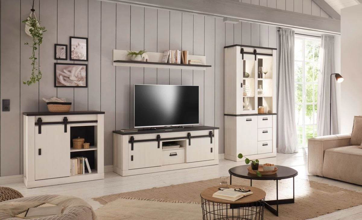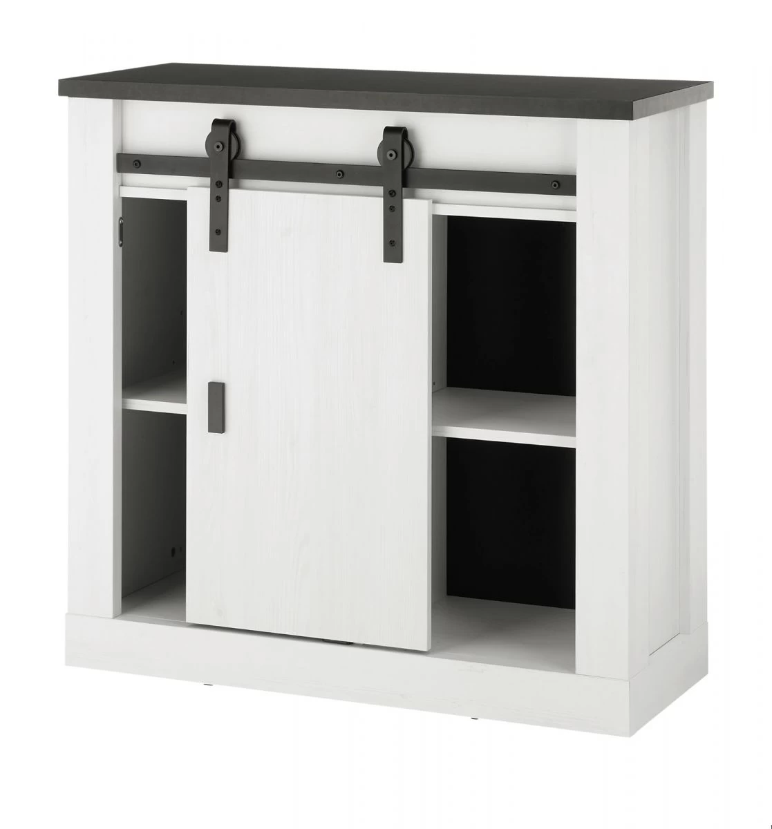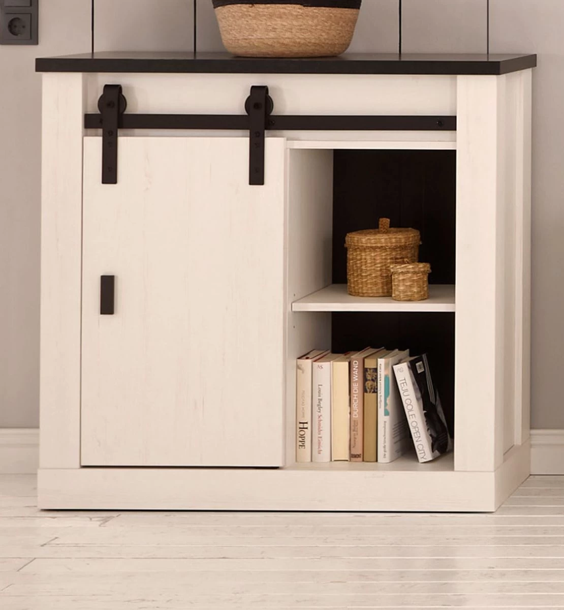 Diese Kommode sorgt für bewundernde Blicke. Das Modell „Stove“ in weiß Pinie und anthrazit (93 x 91 cm) ist eine wahre Bereicherung für jedes Wohn- und Esszimmer und besticht mit einer Schiebetür, hinter der Ihr Hab und Gut untergebracht werden kann. Das Möbelstück ist mit zwei Einlegeböden ausgestattet. Die Kommode besteht aus FSC®-zertifiziertem Material aus nachhaltig bewirtschafteten Wäldern. Dank der besonders strapazierfähigen sowie unempfindlichen Beschaffenheit werden Sie lange Freude an diesem Möbel haben. Das Modell „Stove“ macht in seinem natürlichen Landhausstil eine optimale Figur. Der schwarze Handgriff aus Metall des im Dekor weiß Pinie und in Anthrazit gehaltenen Schranks ist gleichermaßen praktisch wie schön. Das Modell „Stove“ hat eine Breite von 93 cm, eine Gesamthöhe von 91 cm sowie eine Tiefe von 43 cm. Entdecken Sie des Weiteren auch die verschiedenen Größenausführungen. Die Landhaus Kommode „Stove“ verleiht Ihrer Wohnung eine angenehme Atmosphäre.