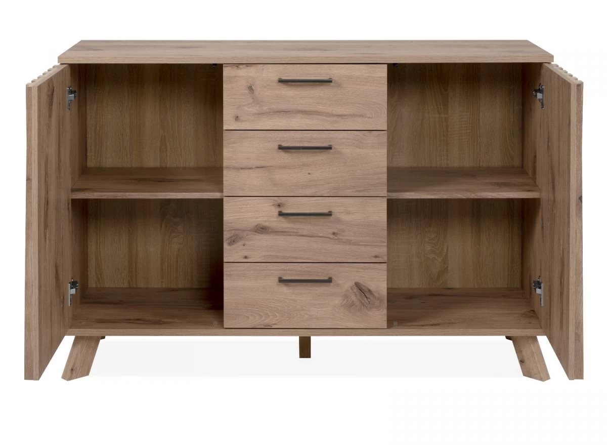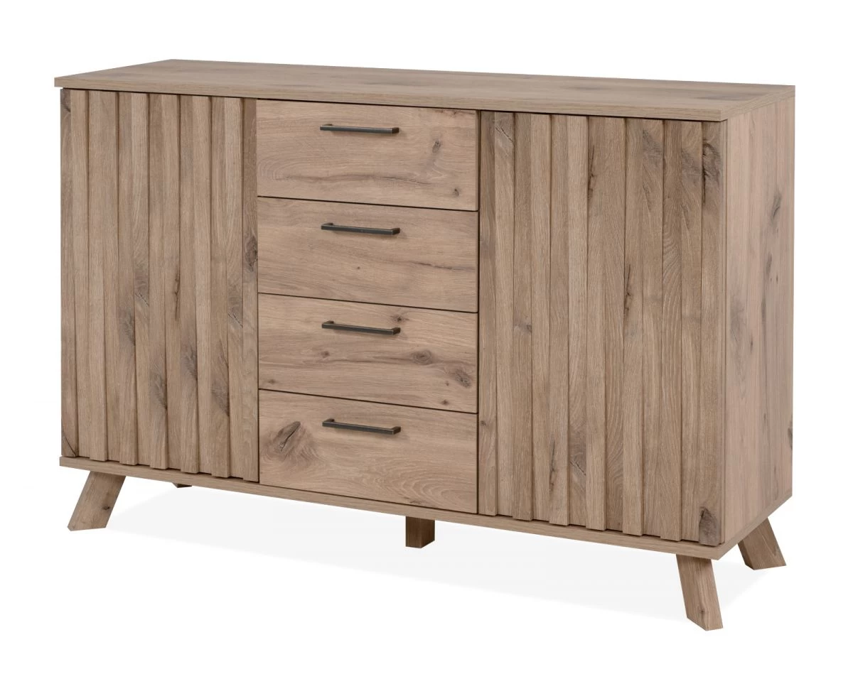Diese Kommode ist ein echter Gewinn für alle Fans stilvoller Möbelstücke. Das Modell „Wellington“ in Schweden Eiche (127 x 85 cm) ist die ideale Lösung für jedes Wohn- und Esszimmer. Die Kommode erweitert mit ihren zwei Türen mit 3-D Reliefoptik Ihren Platz zum Unterbringen verschiedenster Gegenstände und besitzt vier Schubladen, die dazu beitragen, Ihre vier Wände ordentlich zu halten. Sie ist mit zwei Einlegeböden versehen. Eine praktische Push-to-Open-Funktion sorgt für hohe Praktikabilität. Die herausragende Qualität des Möbels zeigt sich in seiner pflegeleichten sowie widerstandsfähigen Beschaffenheit. Das Modell „Wellington“ von Finori ist im Dekor Schweden Eiche gehalten. Die Kommode im natürlichen, modernen Design hat eine Gesamtbreite von 127 cm, eine Höhe von 85 cm sowie eine Tiefe von 40 cm. Sie überzeugt mit vier attraktiven in einem Eisen-/Gold-Farbton gehaltenen Griffen in Antikoptik aus Metall und steht in anderen Größenvarianten zur Verfügung. Diese Kommode aus dem Hause Finori verleiht Ihren vier Wänden eine wohnliche Atmosphäre.