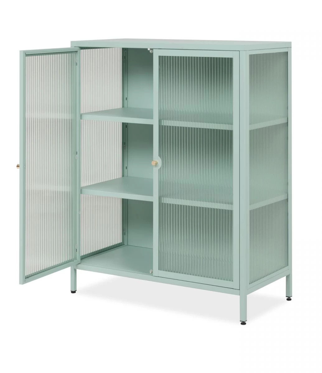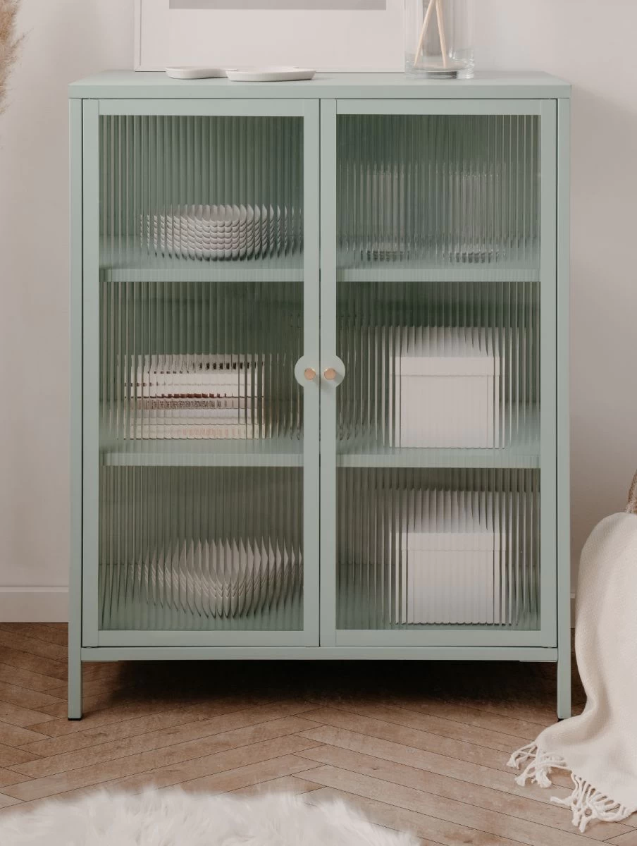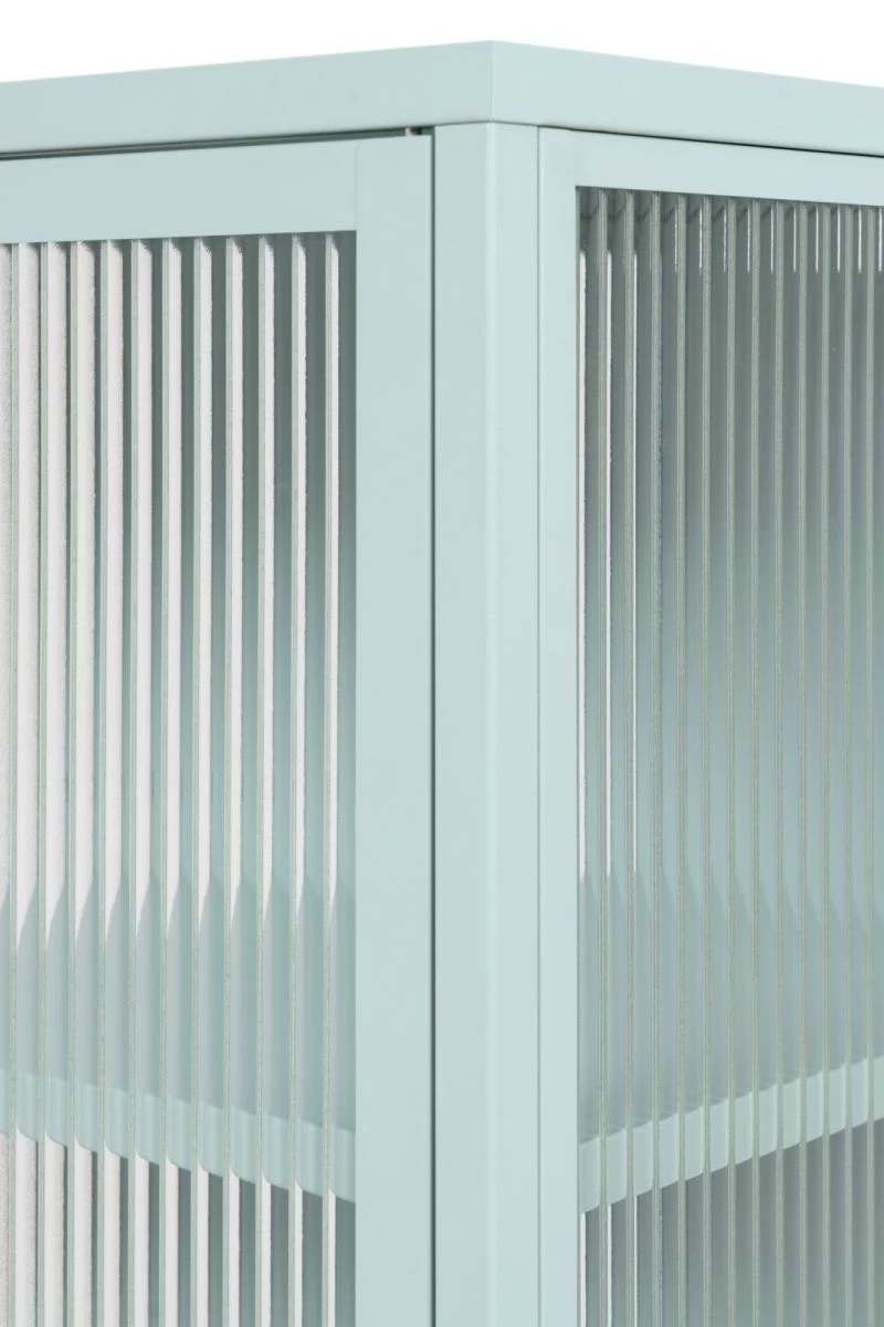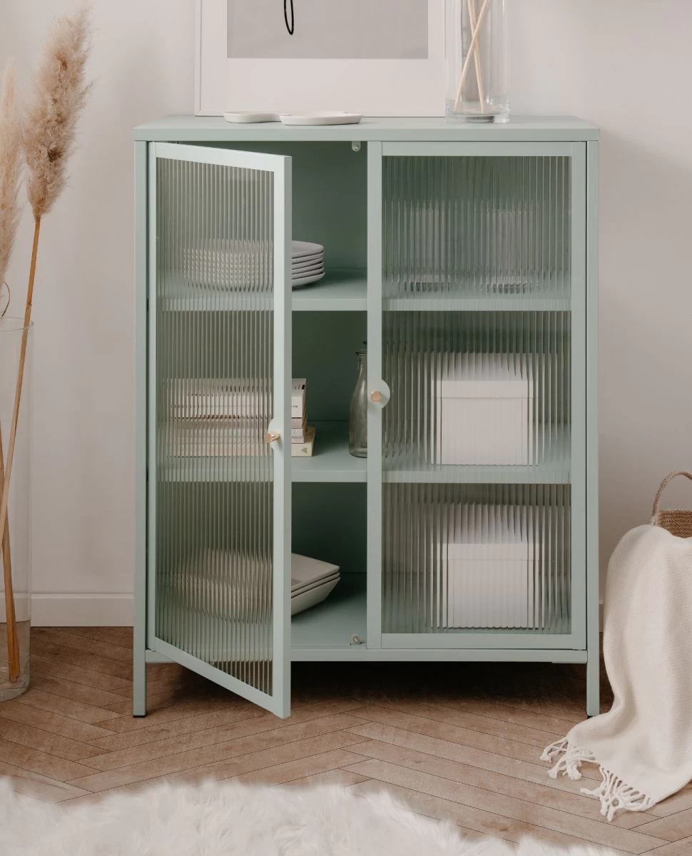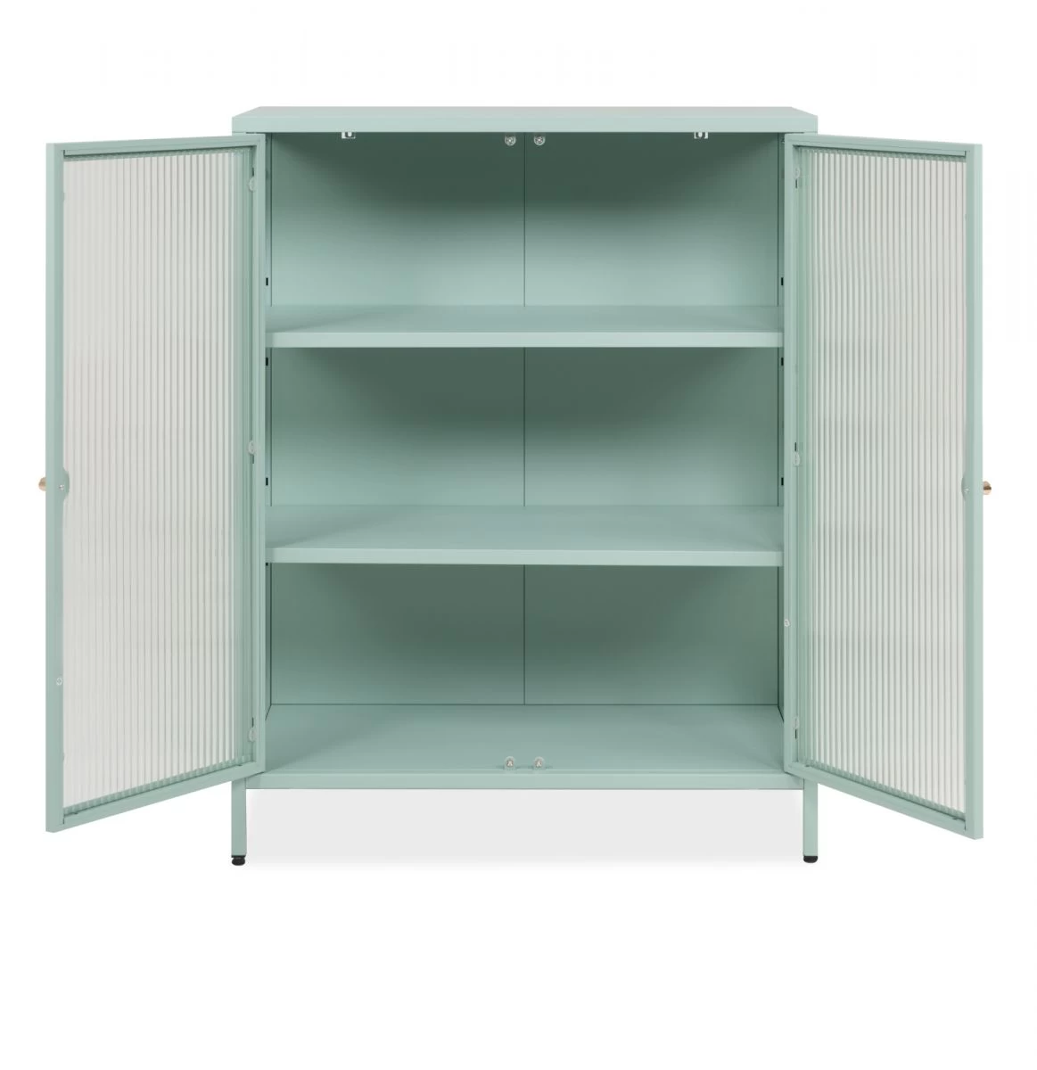 „Milton“ ist eine elegante Metall Kommode in einem erfrischenden Mintgrün. Das Metallgestell aus kaltgewalztem Stahl verleiht ihr Stabilität und Langlebigkeit. Die Front und die Seiten sind mit geriffeltem Glas verziert, was dem Möbelstück einen besonderen Charme verleiht. Die Stahlfüße sind 10 cm hoch und sorgen für einen sicheren Stand. Die goldenen Metallgriffe setzen edle Akzente. Hinter den zwei Glasrahmentüren befinden sich drei Vitrinenfächer, die genügend Platz für Ihre Lieblingsstücke bieten. Zwei Einlegeböden aus Stahl ermöglichen eine individuelle Anpassung der Aufbewahrungsmöglichkeiten. Mit den Magnetschlössern halten Sie die Türen verschlossen. Die Maße von 80 x 102 x 40 cm machen die Metall Kommode „Milton“ zu einem vielseitigen Möbelstück, das in verschiedenen Räumen gut zur Geltung kommt. Der Hersteller Finori bürgt für Qualität und Design. Gönnen Sie sich mit „Milton“ ein Stück Luxus für Ihr Zuhause und bestellen Sie noch heute!