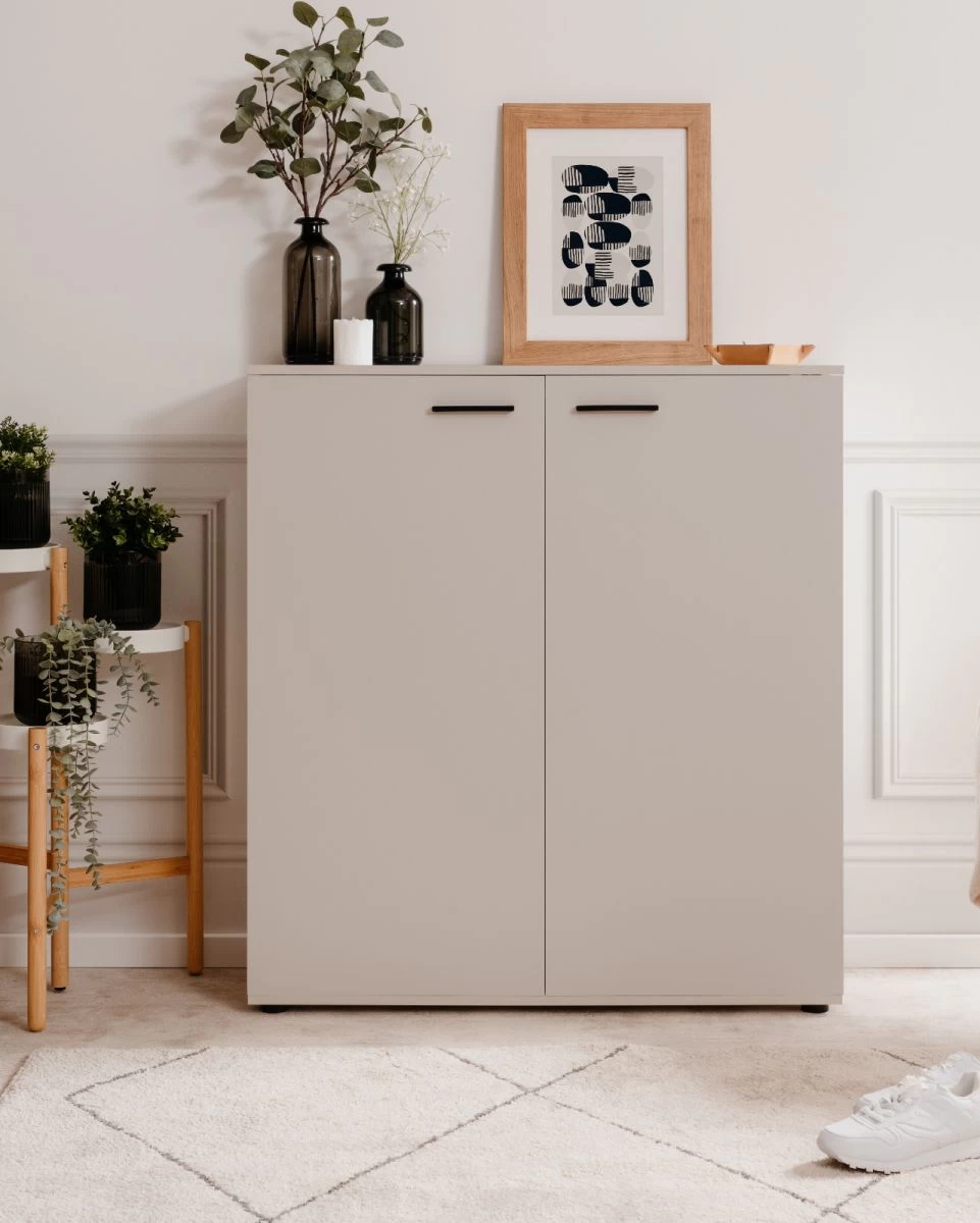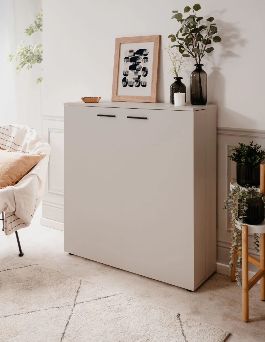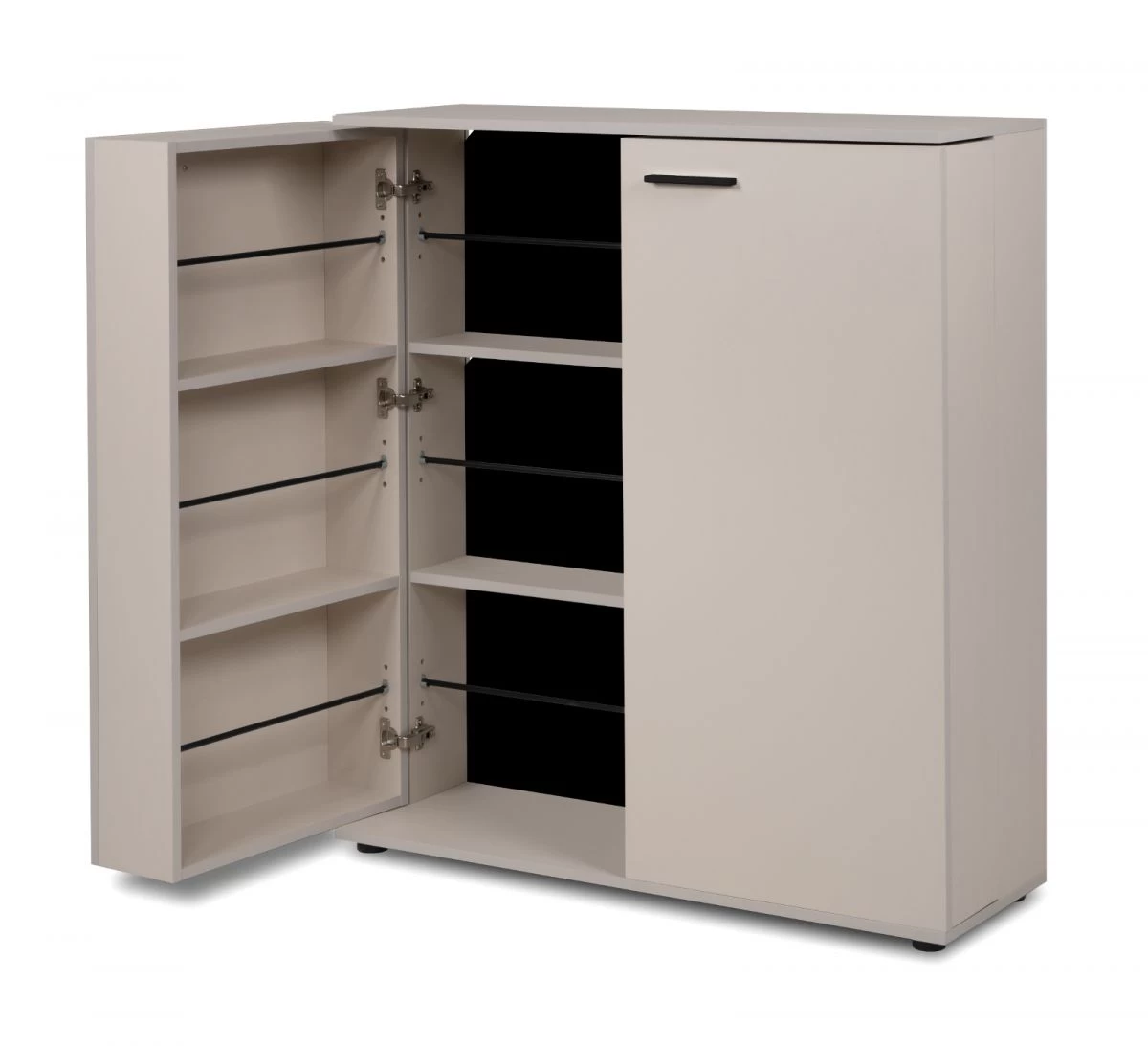 Der elegante Schuhschrank „Satos“ von Finori bietet Platz für bis zu 24 Paar Schuhe. Mit seinem Samtfarbe Dekor und den Griffleisten in Silber ist er nicht nur praktisch, sondern auch ein echter Hingucker. Die 12 Fächer, die sich auch in den beiden Türen befinden, sorgen für Ordnung und Übersichtlichkeit. Mit seinen Maßen von 100 x 110 x 34 cm findet der Schrank in jedem Flur einen Platz. Der Schuhschrank „Satos“ – ein Must-Have für alle Schuhliebhaber!