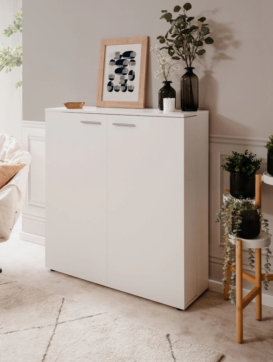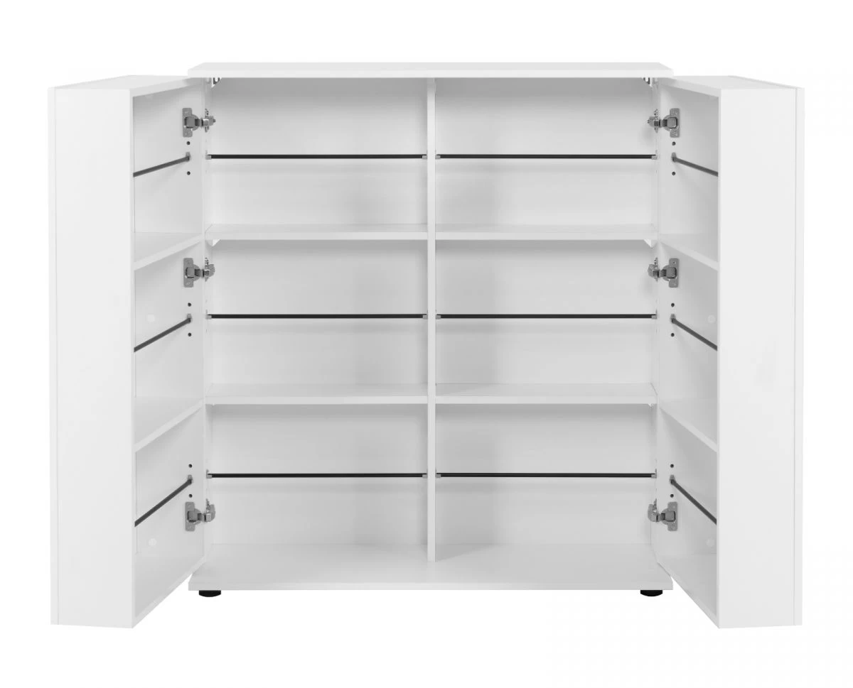 Mit dem Schuhschrank „Satos“ von Finori haben Sie die perfekte Lösung für Ihre Schuhaufbewahrung. Mit seinen 12 Fächern bietet dieser Schrank Platz für bis zu 24 Paar Schuhe, während die Griffleisten in Silberoptik und die weiße Farbe eine elegante Note verleihen. Dank der ABS-Kante ist der Schuhschrank besonders robust und langlebig. Die zwei Türen sorgen für einen leichten Zugang, während die Maße von 100 x 110 x 34 cm wenig Platz in Ihrem Flur einnehmen. Gönnen Sie sich jetzt den Schuhschrank „Satos“ und bringen Sie Ordnung in Ihre Schuhsammlung!