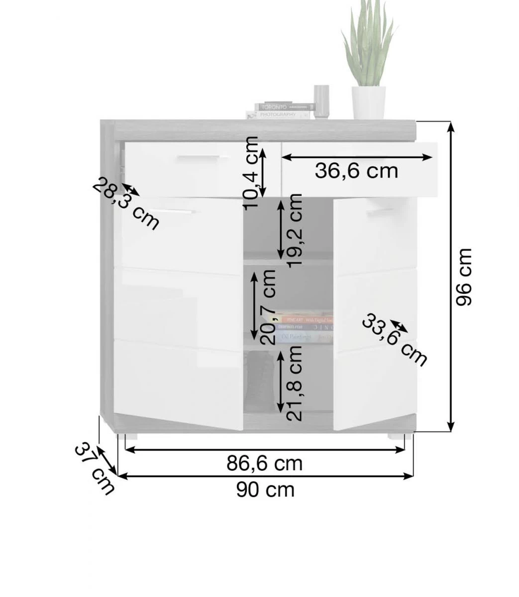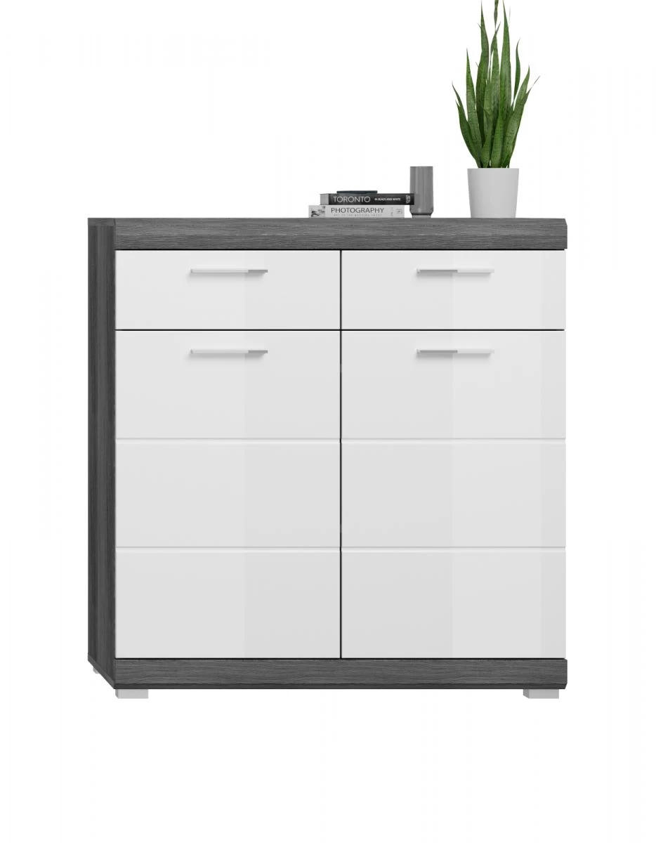 Dieser Schuhschrank schafft schnurstracks Ordnung und eine wohnliche Stimmung in jedem Flur. Das Modell „Scout“ in weiß Hochglanz und Rauchsilber grau (90 x 96 cm) eignet sich optimal für Ihre Diele. Der Schrank ist mit zwei Türen versehen, hinter welchen sich Ihnen Stauraum zum Unterbringen Ihrer Schuhe bietet, und überzeugt mit zwei Schubkästen für Handschuhe, Schals und Mützen. Er stellt zwei Einlegeböden zur Verfügung. Das Modell „Scout“ zeichnet sich durch seine unempfindliche sowie strapazierfähige Beschaffenheit aus. Das verwendete Holz ist mit dem FSC®-Label für nachhaltige Forstwirtschaft ausgezeichnet. Das Flurmöbel in hochglänzendem Weiß und Rauchsilber Grau kann auch optisch durch sein elegantes, zeitloses Design überzeugen. Es glänzt mit vier dekorativen chromfarbenen Griffleisten. Der Schuhschrank „Scout“ hat eine Breite von 90 cm, eine Gesamthöhe von 96 cm sowie eine Tiefe von 37 cm. Mit dieser Schuhkommode von Xonox schaffen Sie zusätzlichen Stauraum in Ihrem Eingangsbereich.