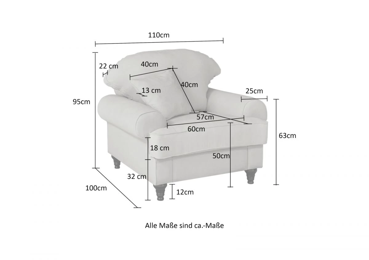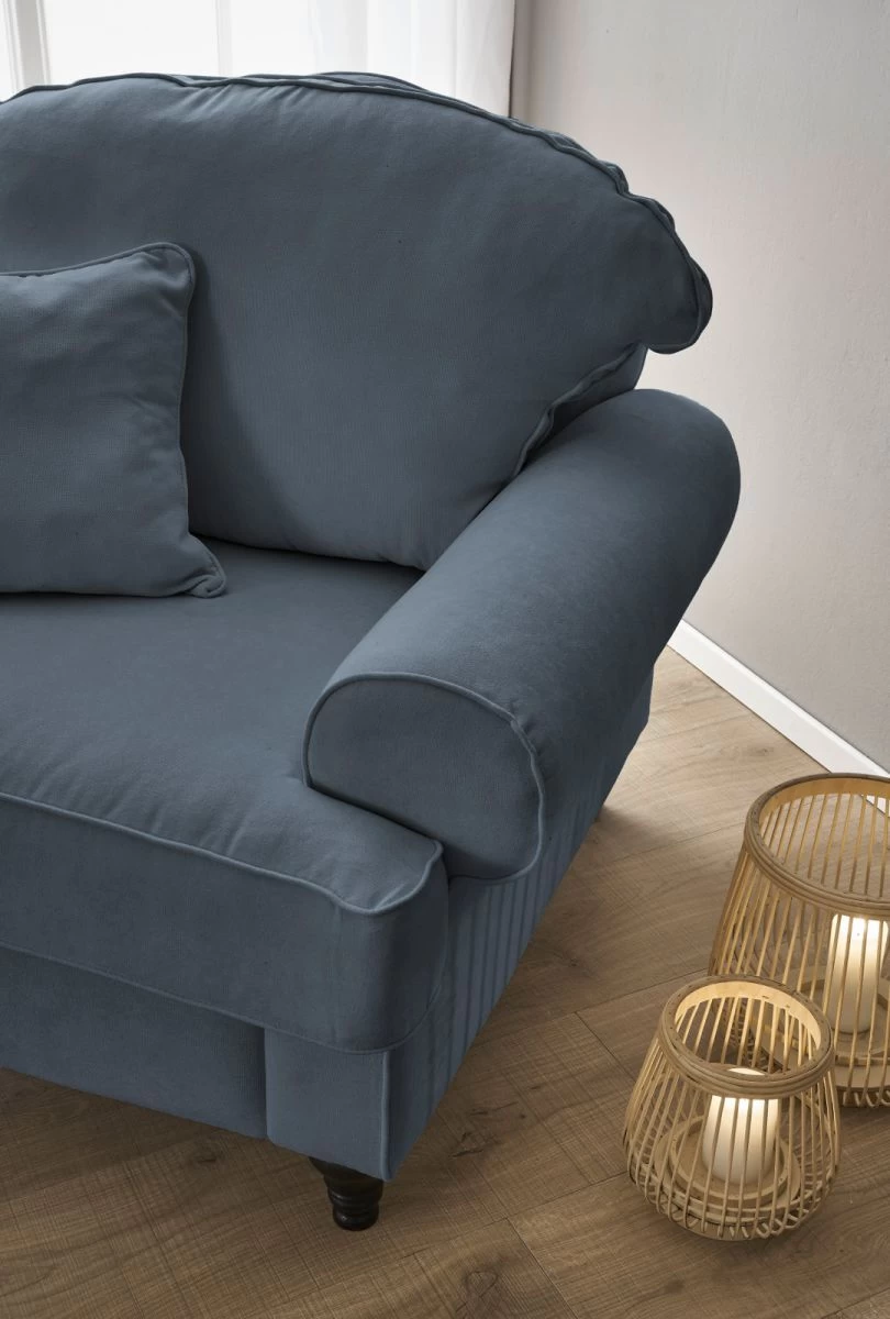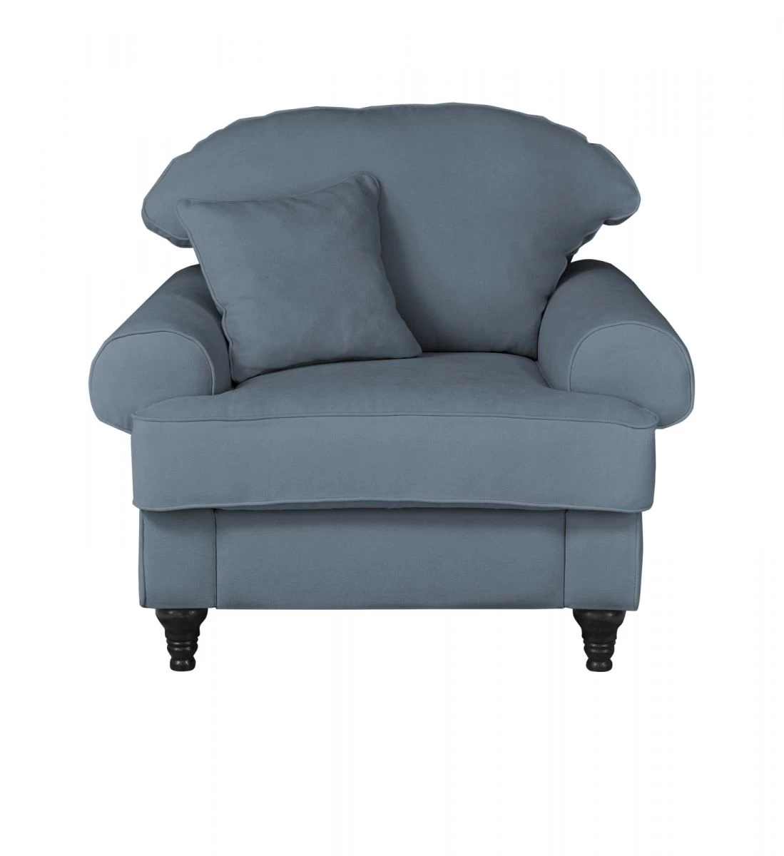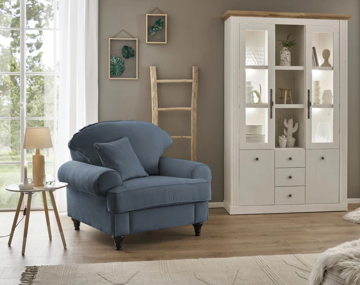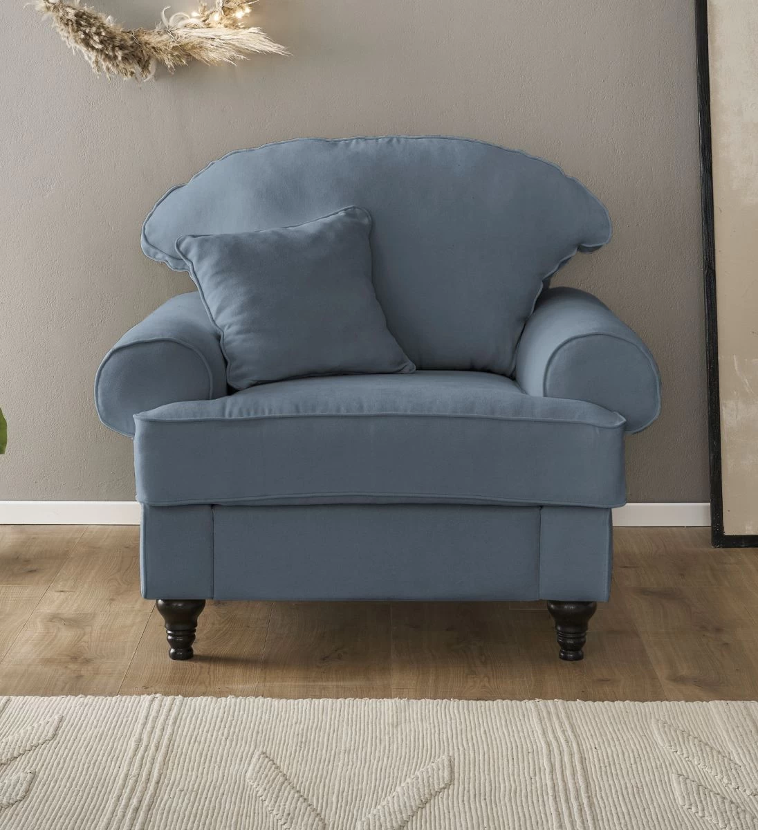 Hoher Sitzkomfort und Behaglichkeit ziehen mit diesem bequemen Sessel in Ihr Zuhause ein. Das Modell „Adelina“ in blau (110 cm) macht in seinem Landhausstil eine ausgezeichnete Figur, eignet sich hervorragend für Ihr Wohnzimmer und ist in Blau gehalten. Die verwendeten Werkstoffe zeichnen sich durch ihre hochwertige Qualität aus. Der Sessel ist mit seinem stilvollen Bezug aus Mikrofaser sehr komfortabel und zeichnet sich vor allem durch die bequeme Polsterung mit Bonell Federkern aus. Die braunen Füße aus Massivholz komplettieren ihn. Besonders komfortabel wird es aufgrund der losen Kissen. Die 63 Zentimeter hohen Armlehnen runden das Polstermöbel ab und sichern so die individuelle Wohlfühlposition. Das Modell „Adelina“ von Furn.Design hat ein Breitenmaß von 110 Zentimetern, eine Gesamthöhe von 95 Zentimetern sowie eine Tiefe von 100 Zentimetern. Die Sitzfläche misst 57 x 60 Zentimeter. Der Landhaus Sessel kann mit 150 Kilogramm belastet werden und weist eine Sitzhöhe von 50 Zentimetern auf. Mit Abriebwerten von mindestens 45000 Scheuertouren ist der Bezug extrem robust. Außerdem kann das Modell „Adelina“ in anderen Farbausführungen gewählt werden. Fühlen Sie sich mit diesem Sessel des Herstellers Furn.Design wie auf Wolke Sieben.
