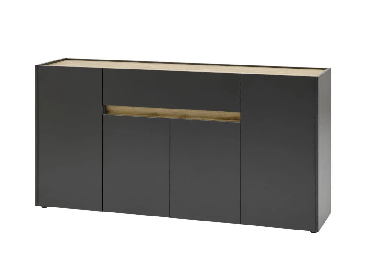 Die Kommode ist grifflos gestaltet und überzeugt so durch ihre geradlinige Optik. Einen attraktiven Kontrast bietet der leicht abgesenkte Oberboden in natürlicher Holzoptik. Dekorative Objekte, wie Schalen und Kerzen, können auf der Ablagefläche platziert werden. Hinter den Türen bietet die Anrichte jede Menge Stauraum für Bücher, Geschirr oder Wohnaccessoires. In dem Schubkasten finden kleinere Utensilien ihren ordentlichen Platz. Für die Herstellung wurde mit FSC®-zertifiziertem Holzwerkstoff ein Material verwendet, das nicht nur besonders hochwertig ist, sondern mit dem auch nachhaltig die Waldwirtschaft gefördert wird. Das elegante Sideboard „Center“ ist eine tolle Ergänzung für die bestehende Wohneinrichtung.