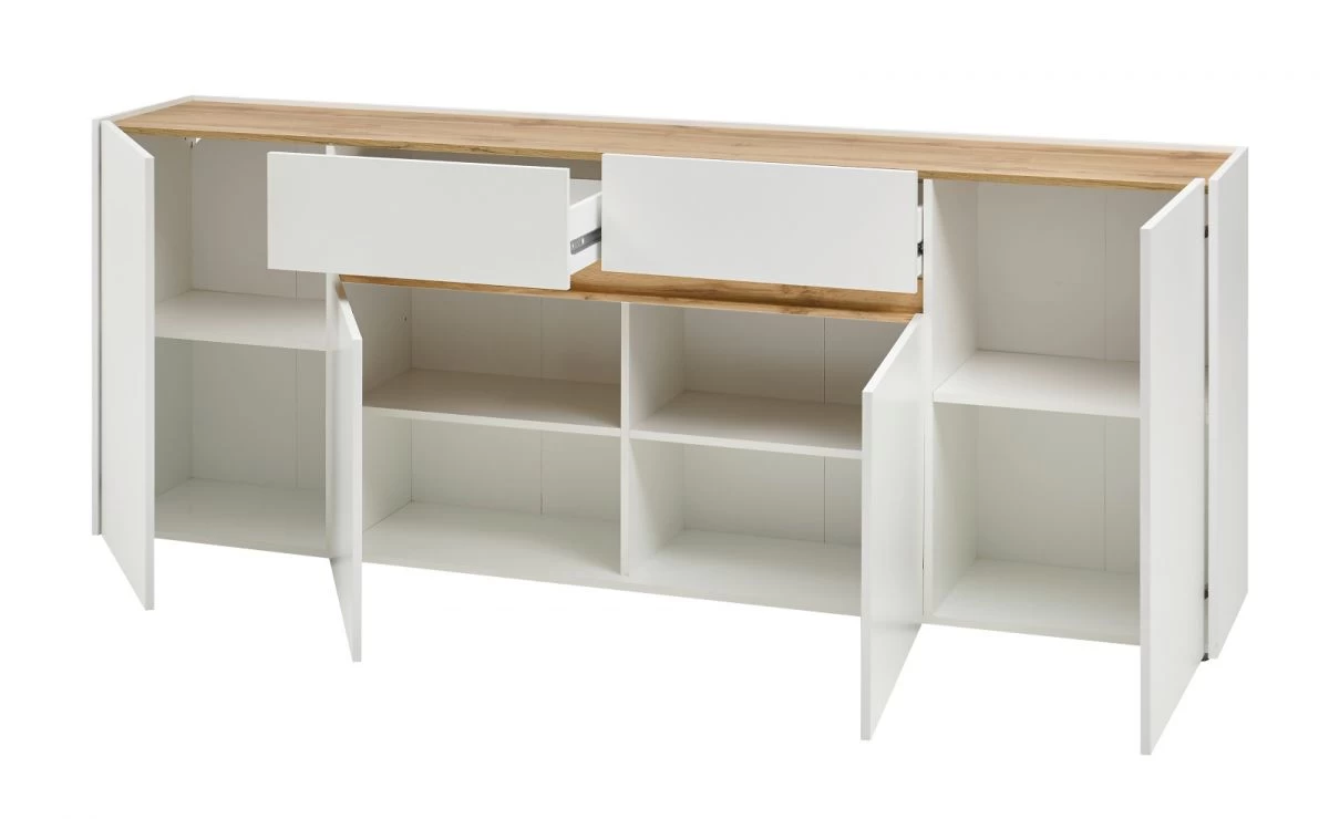 Sie werden dieses Sideboard lieben. Das Modell „Center“ in weiß und Wotan Eiche 220 x 87 cm kann hervorragend in Ihrem Wohnzimmer oder Esszimmer aufgestellt werden. Die Kommode bietet vier Türen und überzeugt mit zwei Schubladen. Sie besitzt vier Einlegeböden. Das moderne sowie elegante Design harmoniert hervorragend mit nahezu jedem Einrichtungskonzept. Das verwendete Holz stammt aus nachhaltig bewirtschafteten Wäldern, wie das FSC®-Gütesiegel bestätigt. Das Sideboard „Center“ ist pflegeleicht und besonders strapazierfähig. Die Kommode besitzt mattweiße Fronten. Sie ist 87 cm hoch, 220 cm breit und 40 cm tief. Entdecken Sie des Weiteren die anderen Größenausführungen der Kommode. Dieses Sideboard verleiht jeder Wohnung ein behagliches Flair. Das Modell „Center“ 220 x 87 cm hat darüber hinaus die folgenden Charakteristika: Der Oberboden und Absetzungen sind im Dekor Wotan Eiche gehalten und die innenliegende Blende und der leicht abgesenkte Oberboden ermöglichen griffloses Öffnen der Türen und des Schubkastens.