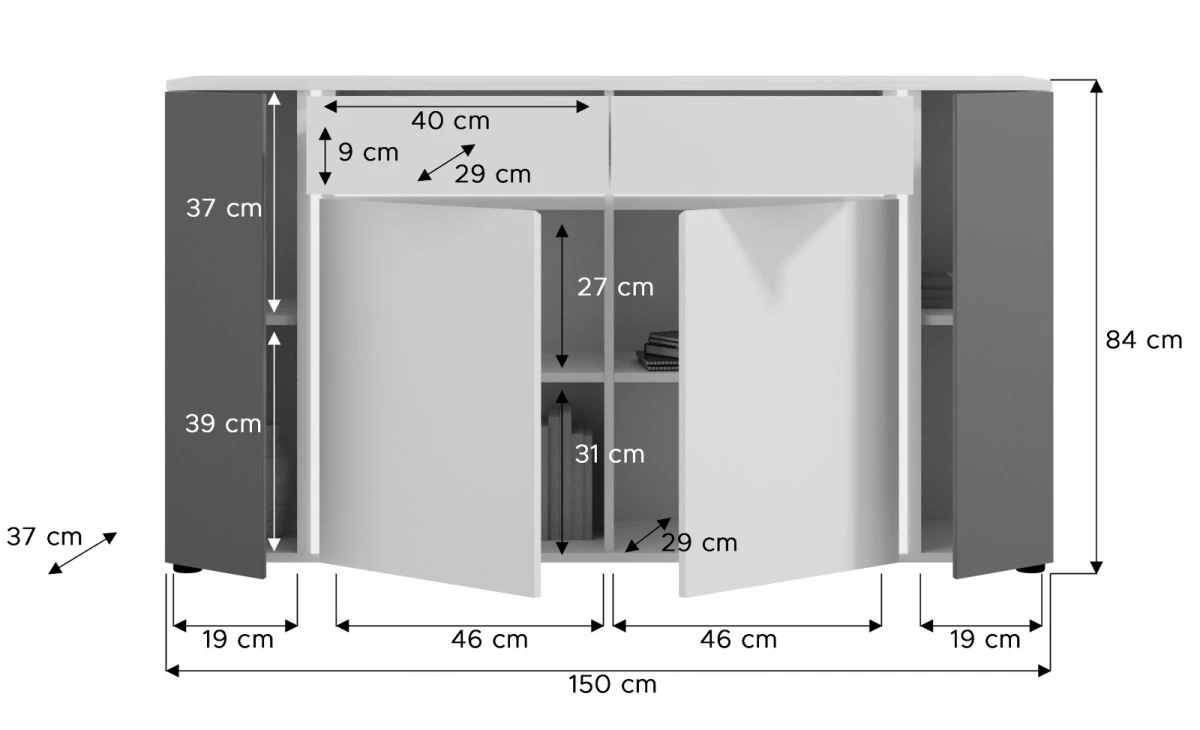 Sie werden dieses Sideboard lieben. Ob im Wohn- oder Esszimmer – das Sideboard „Kato“ in weiß und grau (150 x 84 cm) findet in jedem Zuhause einen Platz. Das Modell „Kato“ aus dem Hause Xonox hat vier Türen mit Platz zum Unterbringen verschiedenster Gegenstände dahinter und besitzt zwei Schubladen, die Ihnen dabei helfen, die Ordnung in Ihren vier Wänden beizubehalten. Zum Einräumen bieten sich acht Einlegeböden an. Als integriertes Highlight gehört eine Frontbeleuchtung zum Möbel dazu. Dank der exzellenten Materialauswahl ist das Möbelstück in den Dekoren Weiß und Grau unempfindlich sowie strapazierfähig. Es macht in seinem modernen, trendigen Design eine ideale Figur und steht aufgrund des FSC®-Gütesiegels für nachhaltige Forstwirtschaft. Das Modell „Kato“ hat eine Breite von 150 Zentimetern, eine Höhe von 84 Zentimetern und eine Tiefe von 37 Zentimetern. Die Kommode ist ganz ohne Griffe zu öffnen und ist in verschiedenen Größenvarianten vorhanden. Dieses Sideboard ist ein echter Blickfang.