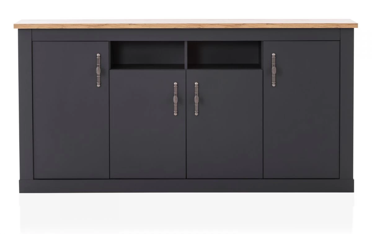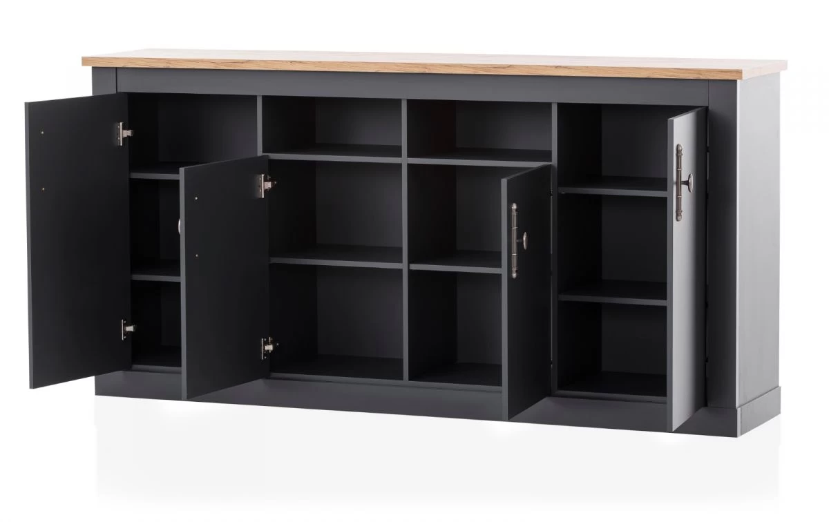 Sie werden das Sideboard „Ribera“ in grau und Wotan Eiche (200 x 104 cm) lieben. Das Möbelstück eignet sich hervorragend für Ihr Wohn- oder Speisezimmer und überzeugt mit vier Türen, hinter welchen sich Ihnen Platz zum Verstauen verschiedenster Gegenstände bietet. Es bringt sechs Einlegeböden mit. Sie werden dank der beiden offenen Ablagefächer viel Freude mit diesem Sideboard haben. Eine praktische Soft-Close-Funktion sorgt für hohe Praktikabilität. Die im Dekor Wotan Eiche gehaltene Deckplatte hebt sich als stylisches Erkennungsmerkmal vom restlichen Möbelstück farblich ab. Aufgrund der exzellenten Materialauswahl ist das Modell „Ribera“ des Herstellers Furn.Design besonders widerstandsfähig und unempfindlich und somit besonders langlebig. Es steht dank des FSC®-Gütesiegels für nachhaltige Forstwirtschaft, macht in seinem ländlichen, modernen Stil eine hervorragende Figur und ist in Grau gehalten. Die Kommode hat eine Breite von 200 Zentimetern, eine Gesamthöhe von 104 Zentimetern sowie eine Tiefe von 45 Zentimetern. Das Modell „Ribera“ von Furn.Design hat vier ästhetische in einem Silber-Farbton gehaltene Handgriffe aus Metall und steht in unterschiedlichen Größenvarianten zur Verfügung. Dieses Sideboard im Landhausstil sorgt für bewundernde Blicke.
