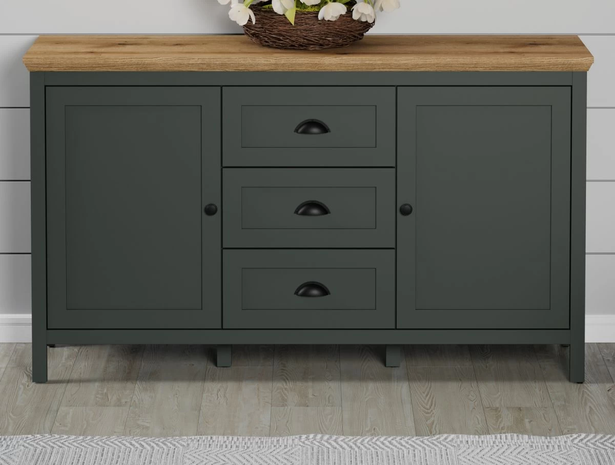 Das Sideboard „Stanton“ in grün und Evoke Eiche (146 x 86 cm) lässt sich in zahlreiche Einrichtungen integrieren. Die Kommode ist ein absoluter Gewinn für jedes Wohn- sowie Esszimmer. Das Sideboard bietet zwei Türen, hinter welchen Porzellan, Vasen und Tischdecken verstaut werden können, und besitzt drei Schubladen, mit denen Sie ganz schnell Ordnung in Ihr Zuhause bringen. Nutzen Sie den Platz von zwei Einlegeböden. Das Modell „Stanton“ steht mit dem FSC®-Label für nachhaltige Forstwirtschaft und wird durch eine schöne Rückwand im Dekor Evoke Eiche stilsicher aufgewertet und verstärkt. Dank der unempfindlichen sowie besonders widerstandsfähigen Beschaffenheit erweist sich das tannengrüne Sideboard von Trendteam als äußerst funktional. Es macht in seinem modernen, Landhaus Stil eine perfekte Figur und verfügt über eine im Dekor Evoke Eiche abgesetzte Deckplatte als zusätzlichen Akzent. Das Modell „Stanton“ aus dem Hause Trendteam weist ein Breitenmaß von insgesamt 146 cm, eine Höhe von 86 cm und eine Tiefe von 45 cm auf. Die Kommode lässt sich mit fünf schönen Griffen in Schwarz öffnen und schließen und wird in weiteren Größenausführungen angeboten. Dieses Sideboard verleiht jedem Zuhause ein wohnliches Ambiente.