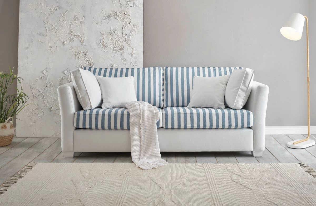 Das Sofa „Hooge“ ist ein elegantes Sitzmöbel im Landhausstil. Mit seinen 2,5 Sitzplätzen bietet es ausreichend Platz für gemütliche Stunden. Das cremefarbene und blau gestreifte Design verleiht dem Sofa eine frische und zeitlose Optik. Die Polsterung besteht aus Bonell Federkern, Komfortschaum und Wellenunterfederung, was für dauerhaft hohen Sitzkomfort sorgt. Der Bezug aus Mikrofaser ist nicht nur angenehm weich, sondern auch besonders widerstandsfähig gegen Pillingbildung und hat eine hohe Scheuerbeständigkeit. Auch die Rückseite des Sofas ist mit dem Originalbezug versehen, sodass es frei im Raum platziert werden kann. Die Holzfüße sind weiß lackiert und bestehen aus Massivholz, was der Couch einen zusätzlichen Hauch von Eleganz verleiht. Mit einer Länge von 200 cm passt das Sofa perfekt in jeden Wohnraum. Es wurde von der Marke Furn.Design entworfen und steht für hochwertige Verarbeitung und zeitloses Design. Verleihen Sie Ihrem Zuhause mit dem Sofa „Hooge“ einen Hauch von Landhausstil und genießen Sie entspannte Stunden in gemütlicher Atmosphäre!