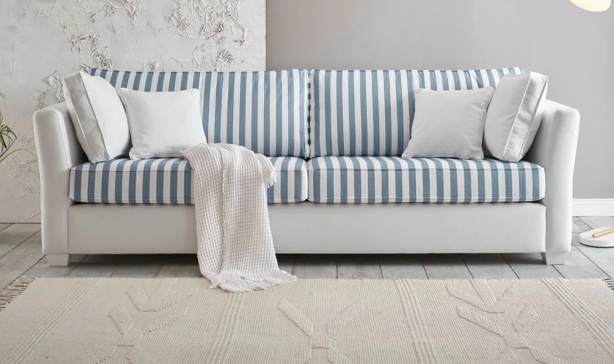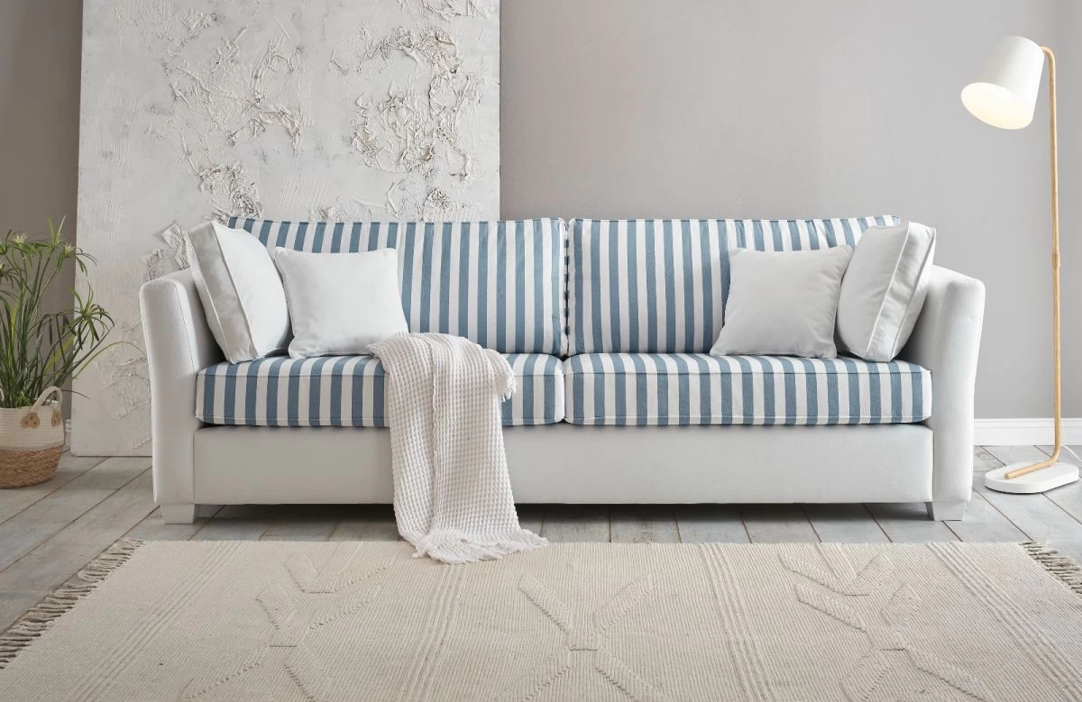 Sie werden von unserem Sofa „Hooge“ begeistert sein. Diese 3-Sitzer Couch im Landhausstil ist ein wahres Schmuckstück für Ihr Zuhause. Die Farbkombination aus cremefarben und blau gestreift verleiht dem Sofa einen charmanten und einladenden Look. Doch nicht nur das Design überzeugt, auch der Komfort lässt keine Wünsche offen. Die Polsterung besteht aus Bonell Federkern, Komfortschaum und Wellenunterfederung, was für eine langlebig optimale Unterstützung beim Sitzen sorgt. Der Bezug aus Mikrofaser ist nicht nur angenehm weich, sondern auch äußerst strapazierfähig. Dank der geringen Pillingbildung bleibt das Sofa auch nach längerer Nutzungsdauer in einem makellosen Zustand. Die Rückseite des Sofas ist ebenfalls mit dem Originalbezug versehen, sodass es frei im Raum positioniert werden kann. Die Holzfüße sind weiß lackiert und bestehen aus Massivholz, was der Couch Stabilität verleiht. Mit einer Länge von 240 cm bietet das Sofa genügend Platz für Sie und Ihre Liebsten. Entdecken Sie mit 3-Sitzer Sofa „Hooge“ von der Marke Furn.Design ein hochwertiges Sitzmöbel für gemütliche Stunden zuhause. Lassen Sie sich von seinem charmanten Landhausstil und seinem hohen Komfort begeistern!
