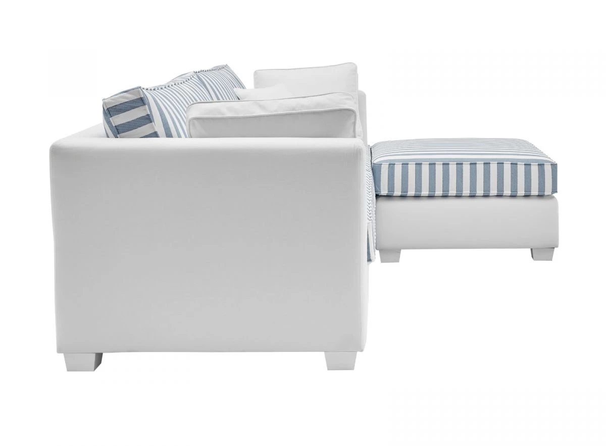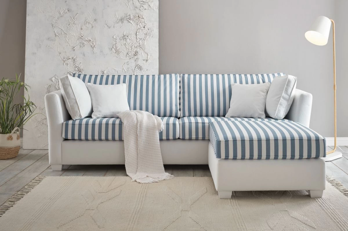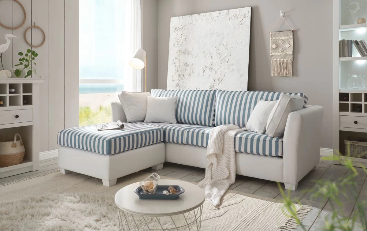 Sofa Set „Hooge“, creme und blau 3-Sitzer Couch inklusive Hocker, Landhausstil
