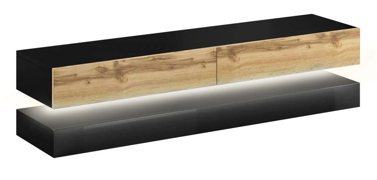 Der two-tone TV-Schrank „Bird“ (BxH: 140 x 45 cm) besteht aus einem strapazierfähigen Korpus in Schwarz Dekor. ABS-Schutzkanten am Korpus ssorgen für eine hohe Strapazierfähigkeit. Dank seiner glatten Oberflächen ist das TV Lowboard zudem sehr pflegeleicht und kann einfach feucht abgewischt werden. Der Clou: Das TV Möbel ist zweiteilig, bestehend aus einem am Boden stehenden Unterteil und einem Wandboard zum Aufhängen. Der Zwischenraum von Board und Unterteil wird mit der weißen LED Beleuchtung gekonnt in Szene gesetzt. Neben dem breiten Ablageboden auf dem Unterteil verfügt das Wandboard über zwei große Schubkästen zur geschützten Aufbewahrung von Medien und Zubehör. Die grifflosen Schubladen mit Unterflurführung können zur Reinigung einfach herausgenommen werden.