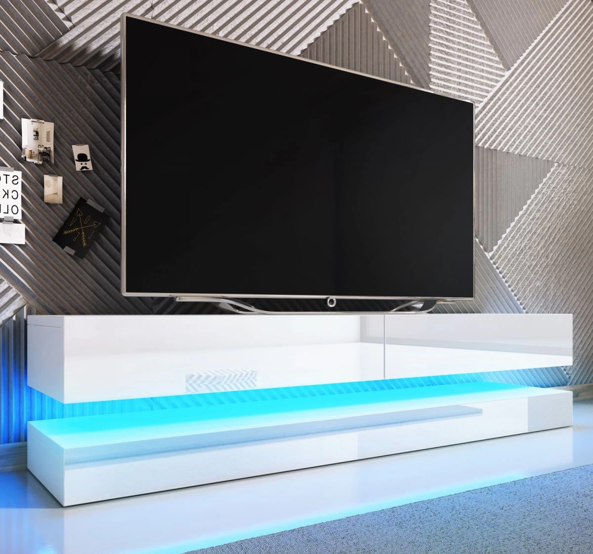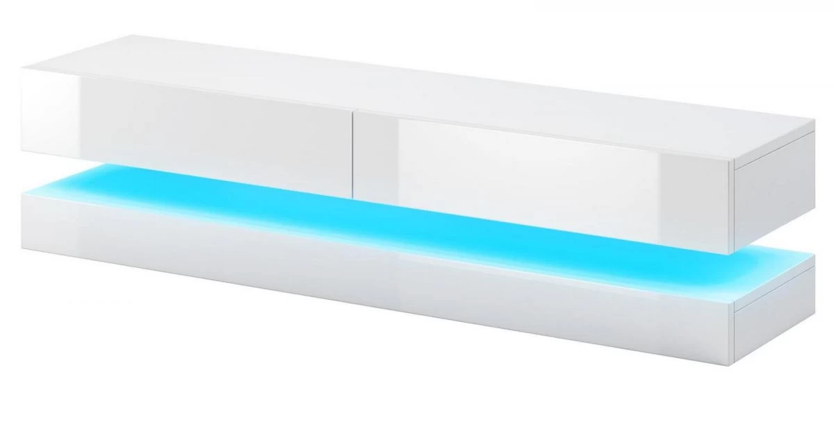 Das puristische TV Lowboard „Bird“ (BxH: 140 x 45 cm) besteht aus einem strapazierfähigen Korpus in Weiß Dekor und einer soliden MDF-Front in Weiß Hochglanz. ABS-Schutzkanten am Korpus verleihen dem Fernsehschrank eine hohe Strapazierfähigkeit. Dank seiner glatten Oberflächen ist das TV Lowboard zudem sehr pflegeleicht und kann einfach feucht abgewischt werden. Das TV Möbel ist zweiteilig, bestehend aus einem am Boden stehenden Unterteil und einem Board zum Aufhängen. Der Zwischenraum von Board und Unterteil wird mit der blauen LED Beleuchtung perfekt in Szene gesetzt. Neben dem breiten Ablageboden auf dem Unterteil verfügt der Fernsehschrank über zwei große Schubkästen mit Unterflurführung. Die grifflosen Schubladen können zur Reinigung einfach herausgenommen werden.
