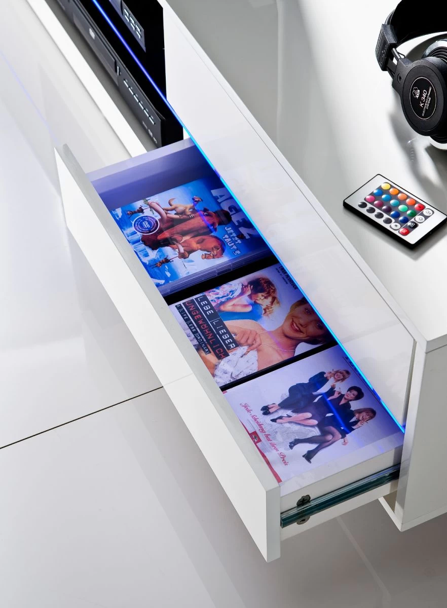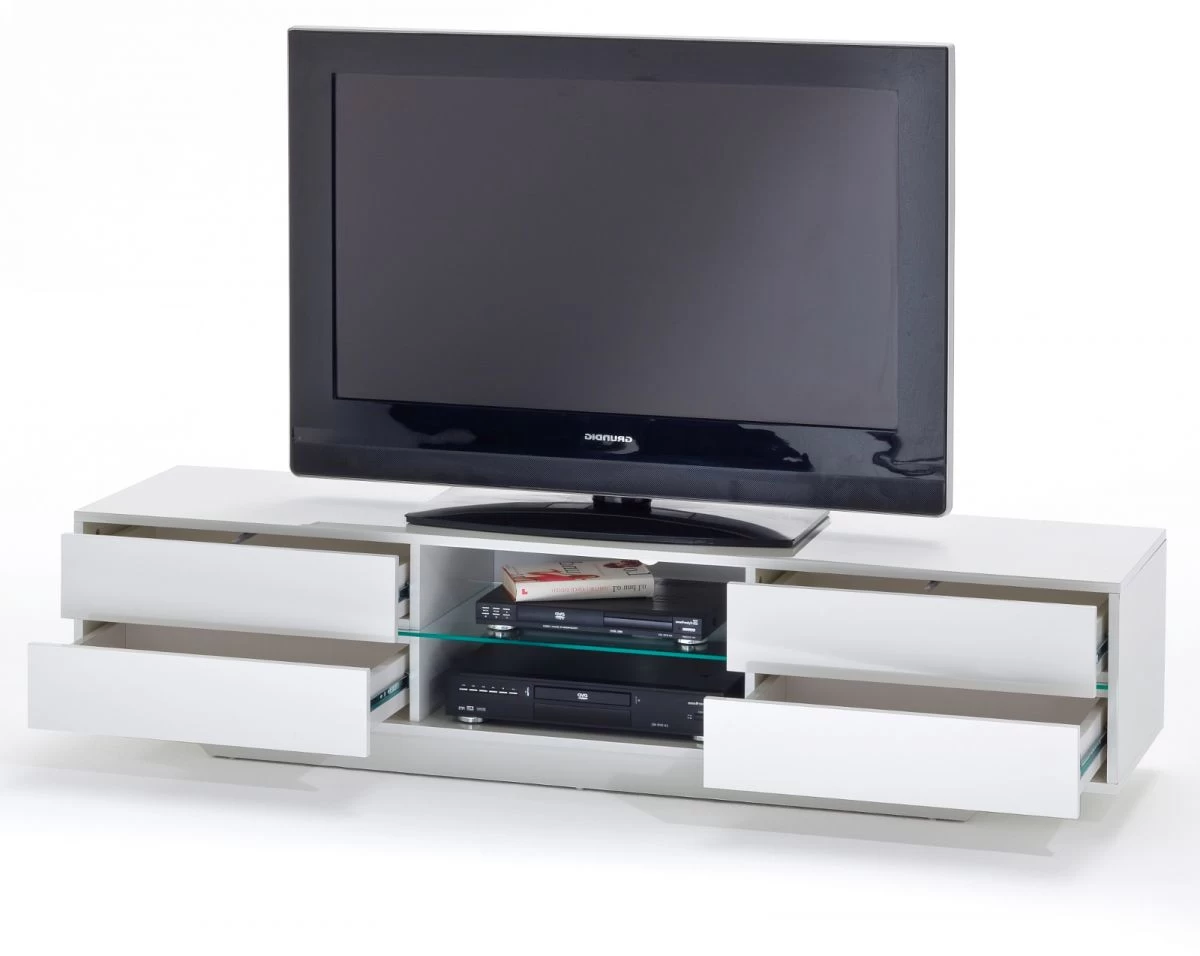 Das TV-Lowboard „Blues“ in weiß Hochglanz lackiert (160 x 36 cm) ist nicht nur praktisch und funktional, sondern sieht auch noch schön aus. Das Medienelement findet in jedem Wohnzimmer seinen Platz. Es besitzt einen Glasboden. Die maximale Belastbarkeit beläuft sich auf bis zu 40 Kilogramm. Sie werden dank der Push-to-Open-Funktion viel Freude mit dem Medienelement „Blues haben. Das TV-Lowboard besitzt vier Schubkästen. Als eingebaute Extras hat es zwei offene Fächer und eine LED-Beleuchtung. Das Modell „Blues“ verfügt über einen Kabeldurchlass. Es macht in seinem modernen sowie hochwertigen Stil eine hervorragende Figur. Die Farbe ist hochglänzendes Weiß. Das Möbelstück ist aus lackiertem MDF gefertigt. Es ist pflegeleicht. Das Modell „Blues“ ist des Weiteren 36 cm hoch, 160 cm breit und 40 cm tief. Das TV-Lowboard von MCA darf in keinem Wohnbereich fehlen. Es begeistert außerdem mit dem Merkmal: alle Schubkästen mit Grifffräsung.