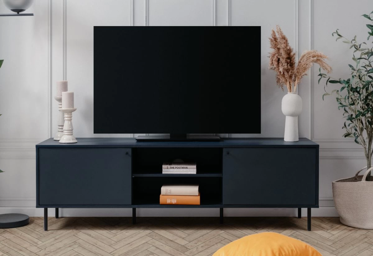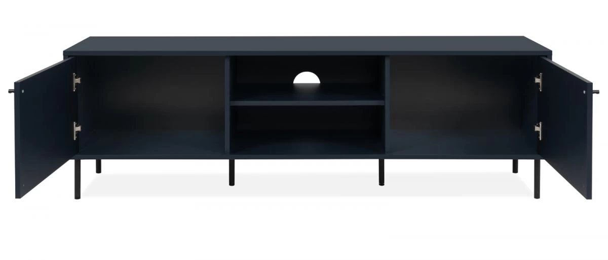„Caracas“ ist ein elegantes TV-Lowboard in Blau mit schwarzen Knopfgriffen aus Metall und schwarzen Metallfüßen. Die Füße sind justierbar und 14 cm hoch. Es verfügt über zwei Türen, zwei geschlossene Fächer für Ihre Medien und Zubehör sowie zwei offene Fächer mit Kabeldurchführung, die Platz für Ihr Entertainment bieten. Die Maße betragen 160 x 50 x 40 cm. Hergestellt wird das hochwertige TV-Lowboard „Caracas“ von Finori. Dieses TV-Möbel ist ideal für ein stilvolles Wohnzimmer – bestellen Sie noch heute!