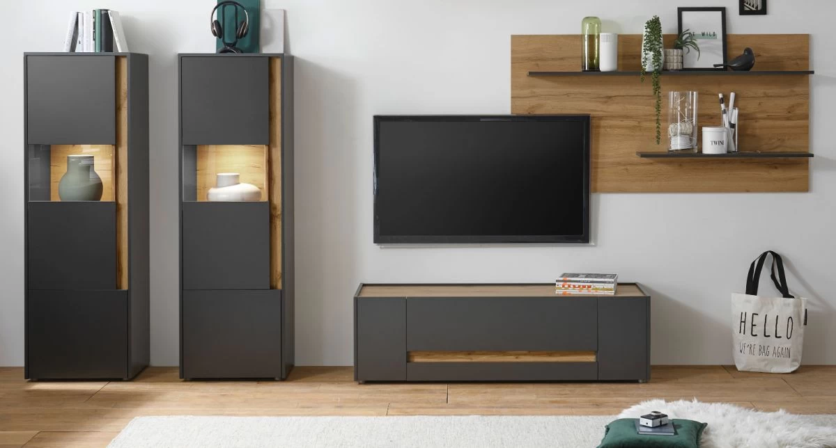Die Optik ist durch den reizvollen Dekormix sowie die klare Linienführung geprägt. Das geradlinige Erscheinungsbild wird durch die grifflose Gestaltung noch unterstrichen. Mit mehreren Fächern und einem geräumigen Schubkasten ausgestattet, bietet das TV-Board zudem viel staubgeschützten Stauraum. Auf der breiten Ablagefläche lässt sich der Fernseher platzieren oder Deko-Objekte in Szene setzen. Hergestellt wird das elegante TV-Board aus FSC®-zertifiziertem Holzwerkstoff. Auch in kleinen Räumen versprüht das Medienmöbel „Center“ seinen besonderen Charme.