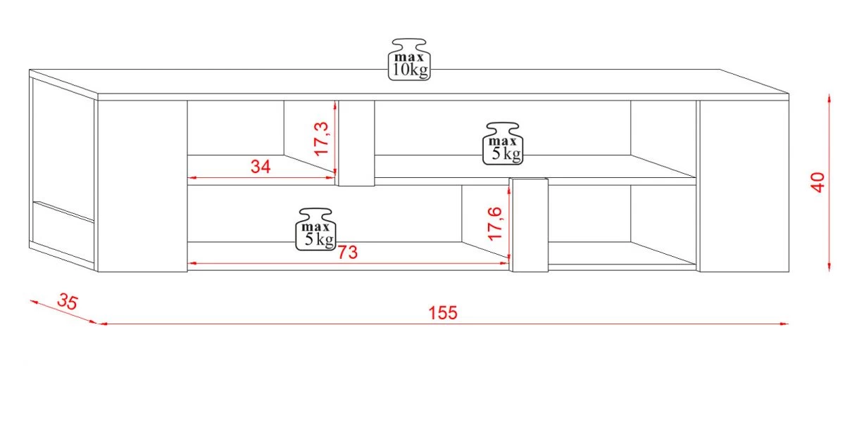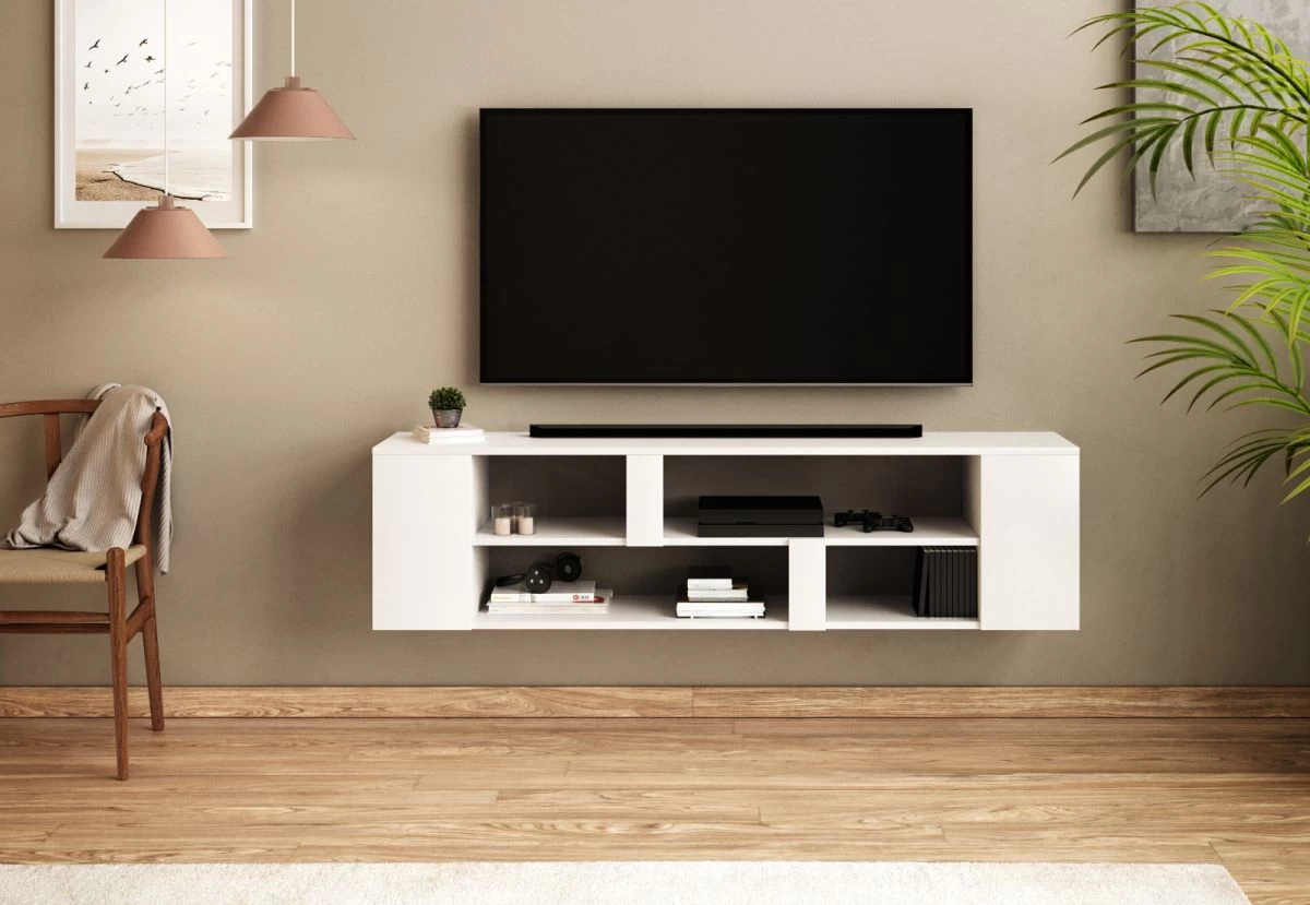Das praktische TV-Lowboard „Clarity“ in weiß (155 x 40 cm) bietet einen perfekten Platz für Ihr Fernsehgerät und die dazu passende Elektronik. Das TV-Möbel ist für Ihr Wohnzimmer hervorragend geeignet. Vier offenen Ablagefächer sind als integriertes Extra verbaut. Das hängende Mediamöbel ist für ein Gewicht von maximal 10 kg ausgelegt. Die Farbe ist neutrales Weiß. Das Modell „Clarity“ kann auch optisch durch sein modernes Design überzeugen. Die exzellente Qualität der verwendeten Materialien erweist sich in ihrer pflegeleichten und besonders widerstandsfähigen Beschaffenheit. Das Modell „Clarity“ hat eine Gesamtbreite von 155 cm, eine Höhe von 40 cm sowie eine Tiefe von 35 cm. Gestalten Sie Ihr Wohnzimmer mit diesem schönen Mediamöbel.