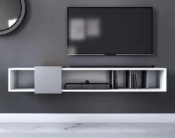 Dank dieses Lowboards haben Sie die Gelegenheit, Ihrem Fernsehgerät einen attraktiven Platz zu geben. Das Modell „Design-T“in weiß und grau (150 x 25 cm) lässt sich hervorragend in Wohnzimmern aufhängen. Sie werden dank der Ablagefläche äußerst viel Freude mit diesem Medienelement haben. Das Möbelstück ist für ein Gewicht von maximal 15 Kilogramm ausgelegt und überzeugt in der Farbe mattes Weiß. In seinem modernen und puristischen Design macht es eine ausgezeichnete Figur. Das Modell „Design-T“ ist strapazierfähig sowie pflegeleicht. Das Medienelement ist aus Holzwerkstoff gefertigt. Es weist eine Höhe von 25 cm, eine Breite von 150 cm und eine Tiefe von 35 cm auf. Entdecken Sie außerdem die weiteren Farbvarianten. Alles ist mit diesem TV-Schrank ansprechend verstaut, was man für einen gemütlichen Fernsehabend braucht. Das TV-Lowboards „Design-T“ in weiß und grau (150 x 25 cm) begeistert darüber hinaus dank der folgenden Besonderheiten: Es verfügt über Absetzungen in grau und eine Rückwand mit Kabeldurchlass.
