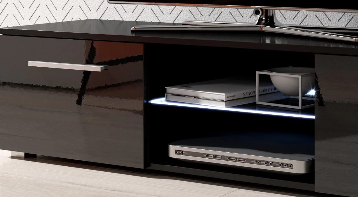 Mit dem Hochglanz TV Lowboard „Earth“ in Schwarz verleihen Sie Ihrem Wohnzimmer ein elegantes Ambiente und schaffen gleichzeitig die perfekte Basis für Ihren Fernseher. Der Fernsehschrank hat einen stabilen Korpus in schwarzem Dekor mit ABS-Schutzkante und edle Hochglanz Fronten in Schwarz. Dank seiner glatten Oberfläche ist das Lowboard herrlich pflegeleicht und kann zur Reinigung einfach mit einem feuchten Tuch abgewischt werden.