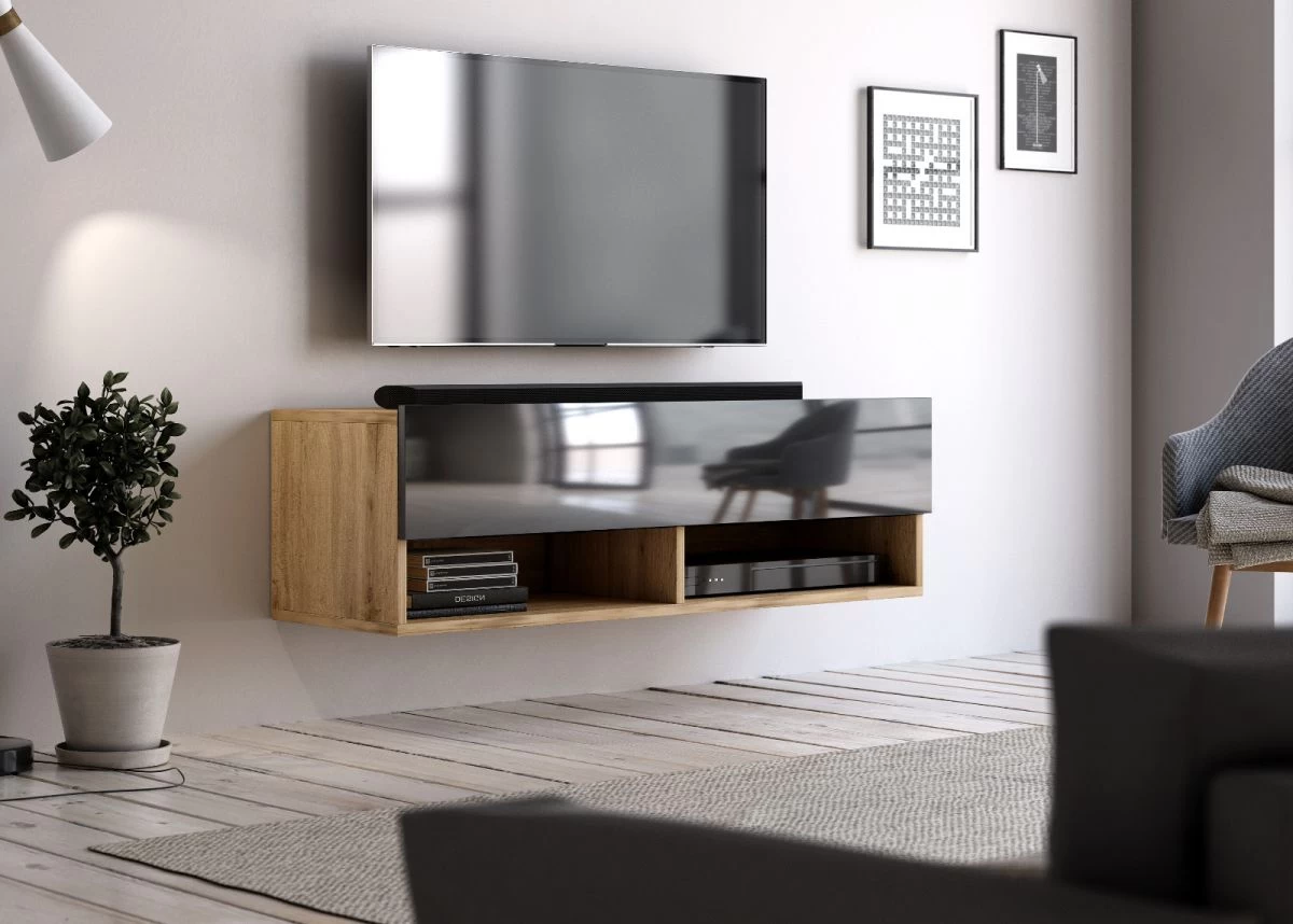 TV-Lowboard „Epsom“, schwarz Hochglanz und Wotan Eiche Dekor, hängend, 100 x 30 cm