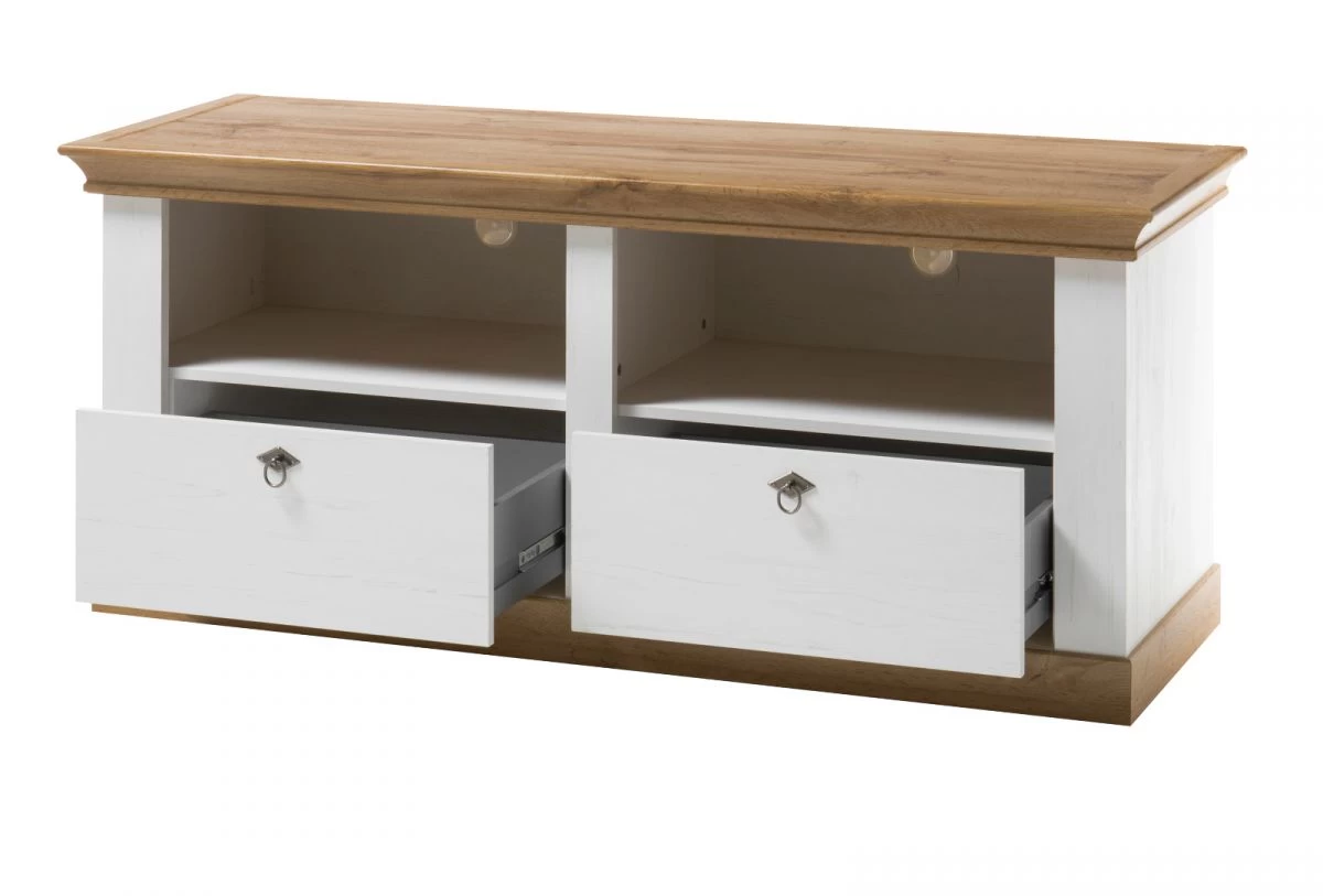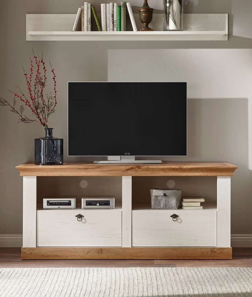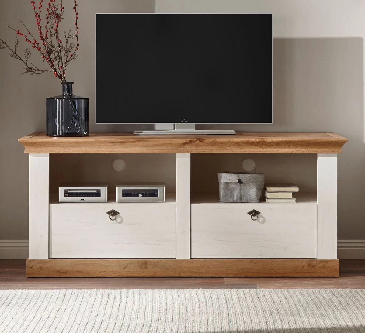 TV-Lowboard „Hemsby“, Pinie weiß und Wotan Eiche, Landhaus, 152 x 64 cm