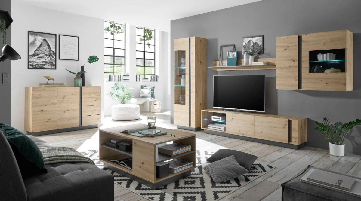 Sie können Ihren Fernseher durch dieses TV-Lowboard ansprechend präsentieren. Das Modell „Louna“ in Eiche Artisan und Graphit grau (188 x 46 cm) lässt sich vortrefflich im Wohnzimmer aufstellen. Das Medienelement besitzt eine Push-to-Open-Funktion als besonderes Extra. Ein praktischer Kabelkanal bündelt die Kabel aller Geräte. Das Möbelstück hat einen Glasboden. Zudem sind zwei offene Ablagefächer Teil des Möbels. Das Modell „Louna“ weist zwei Türen auf. Es vervollständigt Ihr persönliches Wohlfühlkonzept dank des modernen und natürlichen Designs. Der TV-Schrank ist strapazierfähig und pflegeleicht. Durch das FSC-Label leistet „Louna“ einen Beitrag zu mehr Nachhaltigkeit. Das TV-Lowboard ist aus melaminbeschichteter Eiche Nachbildung hergestellt und weist eine Höhe von 46 cm, eine Breite von 188 cm und eine Tiefe von 40 cm auf. Das Modell kann in weiteren Größenvarianten gewählt werden. Dieser TV-Schrank darf in keinem Wohnbereich fehlen. Das Modell „Louna“ begeistert des Weiteren mit den folgenden Besonderheiten: Absetzungen in Graphit grau sowie Touchwood-Oberfläche mit seh- und fühlbarer Holzstruktur.