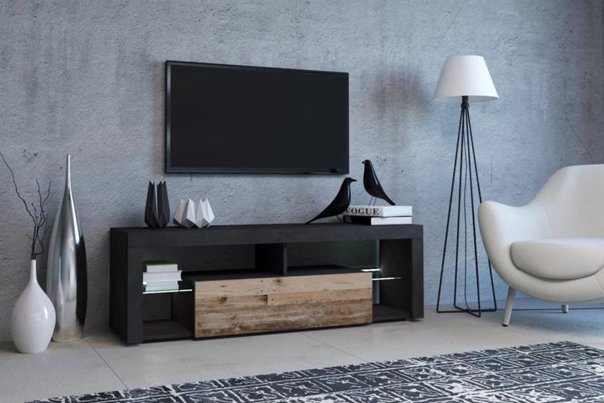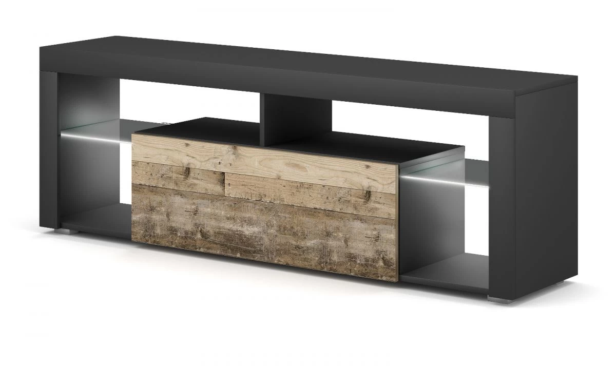 Das TV Lowboard „Mount“ hat einen Korpus im Dekor Matera grau mit ABS-Schutzkante und eine MDF-Front(-Klappe) in hellem Old Used Wood Dekor. Die strapazierfähige Melaminbeschichtung des Korpus ist besonders glatt und pflegeleicht – zum Reinigen genügt feuchtes Abzuwischen. Zur Ausstattung des Fernsehschranks gehören vier offene Ablagefächer sowie zwei offene Gerätefächer und ein geschlossenes Fach hinter der Frontklappe mit Push-Open Funktion. Die vier offenen Fächer sind mit Glaseinlegeböden unterteilt und verfügen über eine moderne LED-Glaskantenbeleuchtung, die im Lieferumfang des TV Lowboards „Mount“ enthalten ist. Beim Glas handelt es sich um robustes 4 mm ESG-Sicherheitsglas. Die Oberseite des TV Schranks bietet Platz für einen Großbildfernseher. Insgesamt überzeugt das TV Lowboard neben Stauraum und Ausstattung durch sein modernes, 2-farbiges Design, das Ihr Wohnzimmer aufwertet.