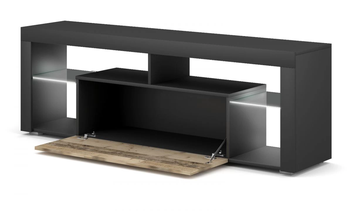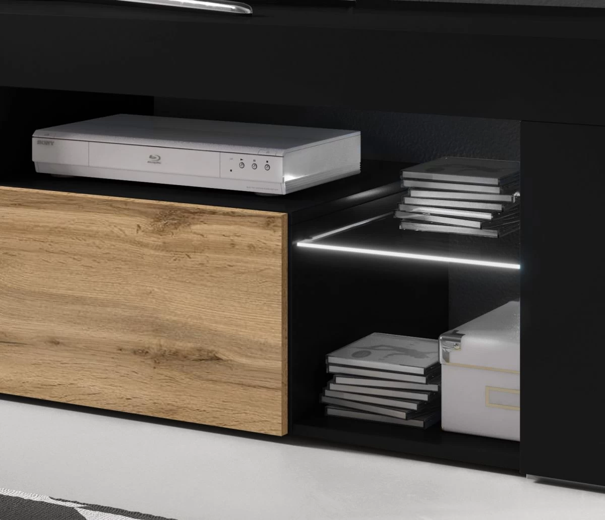 Das TV Lowboard „Mount“ hat einen Korpus im Dekor schwarz mit ABS-Schutzkante und eine MDF-Front(-Klappe) in Wotan Eiche Dekor. Die Korpus-Oberflächen sind mit strapazierfähigem Melamin beschichtet, das sich zur Reinigung einfach feucht abgewischen lässt. Zur Ausstattung des Fernsehschranks gehören vier offene Ablagefächer, zwei offene Gerätefächer und eine Klappe mit Push-Open Funktion. Die offenen Fächer sind mit Glaseinlegeböden unterteilt und verfügen über eine moderne LED-Glaskantenbeleuchtung, die im Lieferumfang enthalten ist. Beim Glas handelt es sich um 4 mm starkes ESG-Sicherheitsglas. Die Oberseite des TV Schranks ist groß genug für einen Großbildfernseher. Insgesamt überzeugt das TV Lowboard neben Stauraum und Qualität mit seinem modernen, 2-farbigen Design, das Ihr Wohnzimmer aufwertet.