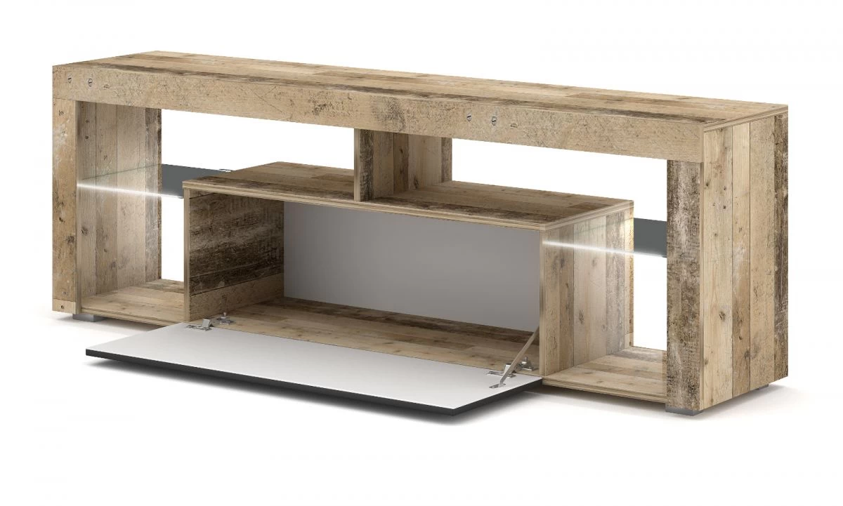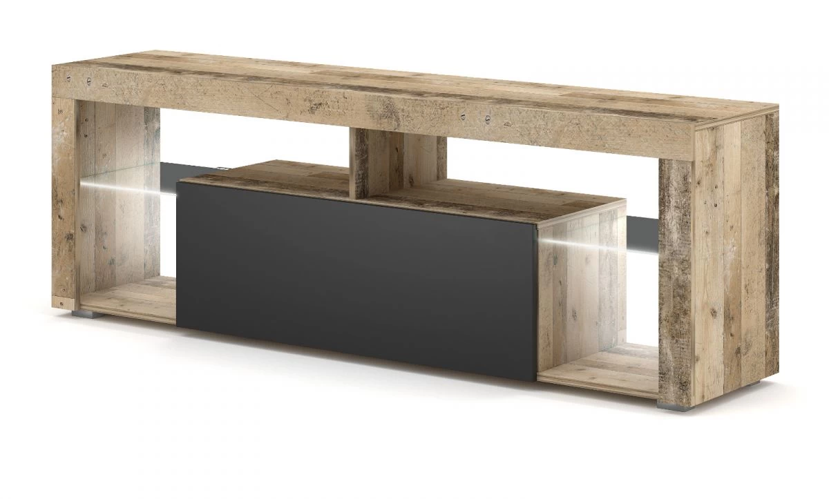 Das TV Lowboard „Mount“ hat einen Korpus im Dekor Old Used Wood hell mit ABS-Schutzkante und eine MDF-Front(-Klappe) in Matera grau Dekor. Die strapazierfähige Melaminbeschichtung des Korpus ist sehr glatt und damit pflegeleicht – zum Reinigen der Oberflächen genügt feuchtes Abzuwischen. Ausgestattet ist der Fernsehschrank mit vier offene Ablagefächern sowie zwei offenen Gerätefächern und einem geschlossenen Fach hinter der Frontklappe mit Push-Open Funktion. Die vier offenen Fächer sind durch Glaseinlegeböden unterteilt und verfügen über eine LED-Glaskantenbeleuchtung, die im Lieferumfang enthalten ist. Beim Glas handelt es sich um robustes, 4 mm starkes ESG-Sicherheitsglas. Die Oberseite des TV Schranks bietet genug Platz für einen Großbildfernseher. Insgesamt überzeugt das TV Lowboard neben Stauraum und Ausstattung durch sein attraktives, 2-farbiges Design, das Ihr Wohnzimmer bereichert.