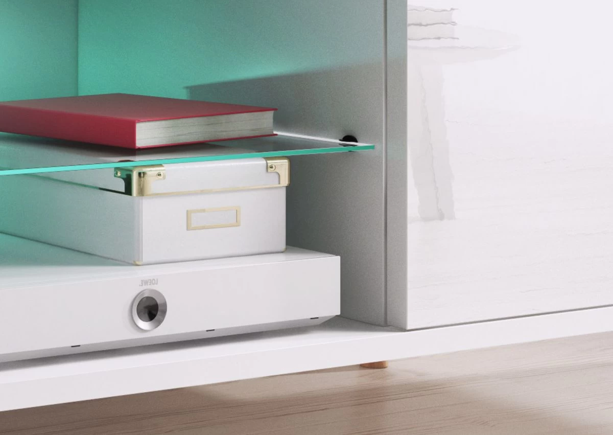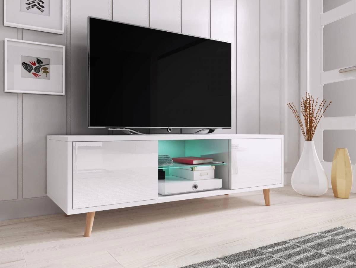 Das skandinavisch gestaltete TV-Unterteil kombiniert einen Korpus in weißem Dekor mit edlen MDF-Fronten in weiß Hochglanz und dazu passenden, leicht schräg gestellten Holzfüßen. Dank strapazierfähiger Melaminbeschichtung und ABS-(Schutz-)Kanten ist das Möbelstück besonders kratz- und stoßfest und lässt sich obendrein ganz einfach reinigen. Die grifflosen Türen öffnen mittels Push-Open Funktion sehr komfortabel und offenbaren zwei geräumige Fächer für Medien und vieles mehr. Darüber hinaus ist der TV-Schrank „Norway-1“ mit zwei offenen Gerätefächern – horizontal getrennt durch einen 4 mm starken ESG-Glaseinlegeboden – und mit einem Kabeldurchlass ausgestattet. Optional können Sie abends die Gerätefächer mit einer blauen LED-Glaskantenbeleuchtung in Szene setzen. Das passende Beleuchtungs-Set kann einfach dazu bestellt werden.