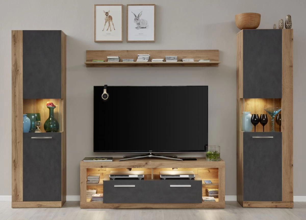 Das praktische Medienelement „Rock“ in Anthrazit und Eiche (150 x 48 cm) vereint Komfort und Ordnung. Das TV-Möbel stellt in Wohnzimmern ein echtes Highlight dar. Es besitzt eine Tür. Damit Kabel von Monitoren, Laptops oder Lautsprechern verstaut werden können, ist das Modell „Rock“ in Anthrazit und Eiche (150 x 48 cm) mit 2 x Kabeldurchlass ausgestattet. Das TV-Möbel ist mit zwei Einlegeböden versehen. In seinem modernen und trendigen Design macht es eine ideale Figur. Das TV-Lowboard des Herstellers Trendteam präsentiert sich in der Farbe Wotan Eiche. Das verwendete Holz stammt aus nachhaltiger Forstwirtschaft, was das FSC®-Gütesiegel bestätigt. Das Mediamöbel ist besonders strapazierfähig sowie pflegeleicht. Es ist aus strukturiertem Holzwerkstoff hergestellt. Das Lowboard „Rock“ besitzt Matera anthrazitfarbene Fronten. Es ist zudem 48 cm hoch, 150 cm breit und 44 cm tief. Beachten Sie die verschiedenen Farb- und Größenausführungen des TV-Möbels. Alles ist durch dieses Lowboard ansprechend untergebracht, was man für einen entspannten Fernsehabend braucht.