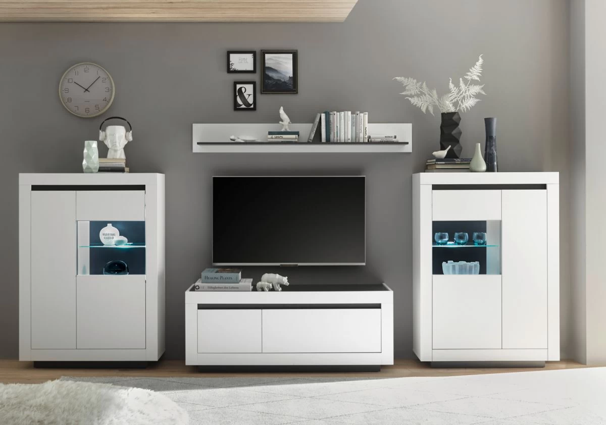 Dieses TV-Lowboard sorgt für bewundernde Blicke. Das Modell „Rooky“ in weiß und anthrazit (140 x 56 cm) ist für jedes Wohnzimmer ausgezeichnet geeignet und besitzt eine Tür und eine Klappe mit Stauraum zum Unterbringen verschiedenster Medien und Gegenstände dahinter. Das TV-Element überzeugt mit einem gelungenen Design, das durch die farblich abgesetzte anthrazitfarbene Deckplatte perfektioniert wird, und steht durch das FSC®-Label für nachhaltige Forstwirtschaft. Der in den Farben weiß und anthrazit gestaltete TV-Schrank zeichnet sich durch seine besonders widerstandsfähige und pflegeleichte Beschaffenheit aus. Das Modell „Rooky“ ergänzt Ihr persönliches Einrichtungskonzept durch das moderne, trendige Design. Es hat eine Breite von 140 cm, eine Gesamthöhe von 56 cm und eine Tiefe von 50 cm. Die TV-Kommode kann unkompliziert ohne Griffe geöffnet und geschlossen werden, besitzt eine Belastbarkeit von bis zu 30 kg und steht in verschiedenen Größenvarianten zur Auswahl. Das TV-Lowboard „Rooky“ verleiht Ihrem Wohnzimmer ein heimeliges Flair.