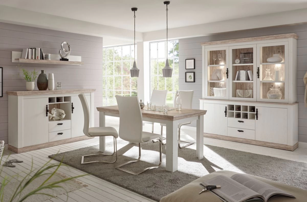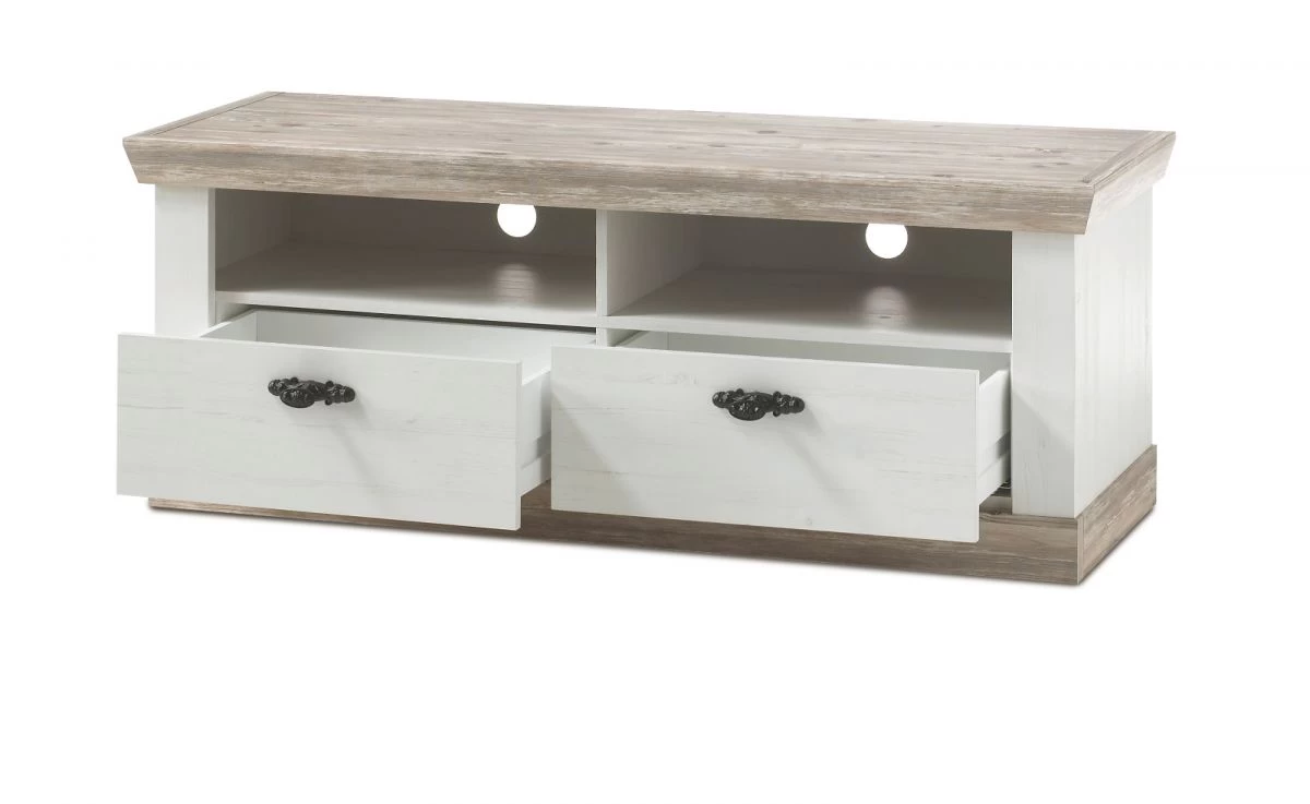 Optisch punktet das Wohnzimmermöbel mit natürlicher Holzoptik sowie aufwendig gearbeiteten Griffen im Antik-Look. Unter dem Oberboden sind zwei offene Gerätefächer mit Kabeldurchlass, die sich für die Spielekonsole oder den DVD-Player anbieten. Ergänzend dazu ist das TV-Unterteil mit mehreren Schubkästen ausgestattet, in denen Zeitschriften, Fernbedienungen und DVDs ihren aufgeräumten Platz finden. Hergestellt wird das Möbel im Landhausstil aus FSC®-zertifiziertem Holzwerkstoff.