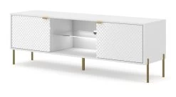 Dieses TV-Lowboard verleiht Ihrem Zuhause eine behagliche Atmosphäre. Das Modell „Rubin“ in weiß Glanz (153 x 54 cm) passt hervorragend in Ihr Wohnzimmer und erweitert mit seinen zwei Türen Ihren Platz zum Unterbringen Ihrer Medien. Sie werden dank der nützlichen Soft-Close-Funktion sehr viel Freude mit diesem TV-Schrank haben. Ein Glasboden bietet sich zum Verstauen an. Ein nützlicher Durchlass organisiert die Kabel von technischen Geräten, sodass kein lästiges Chaos entstehen kann. Zu diesem TV-Möbel gehören zwei offene Ablagefächer und eine LED-Beleuchtung als integrierte Extras. Dank der herausragenden Materialauswahl ist das TV-Lowboard im eleganten, modernen Design pflegeleicht und besonders strapazierfähig und somit zuverlässig. Der weiße Korpus rundet das Erscheinungsbild perfekt ab. Das Modell „Rubin“ weist ein Längenmaß von insgesamt 54 cm, ein Breitenmaß von 153 cm, eine Höhe von 92 cm und ein Tiefenmaß von 42 cm auf. Die zwei ästhetischen in der Farbe Gold gehaltenen Handgriffe aus Metall liegen gut in der Hand. Das Mediamöbel vermag mit Fronten aus 3-D geformtem MDF in glänzendem Weiß zu begeistern. Die goldenen Füße aus Metall sind ein stimmiges Detail im äußerst stilvollen Gesamtbild. Sie werden dieses TV-Lowboard lieben.
