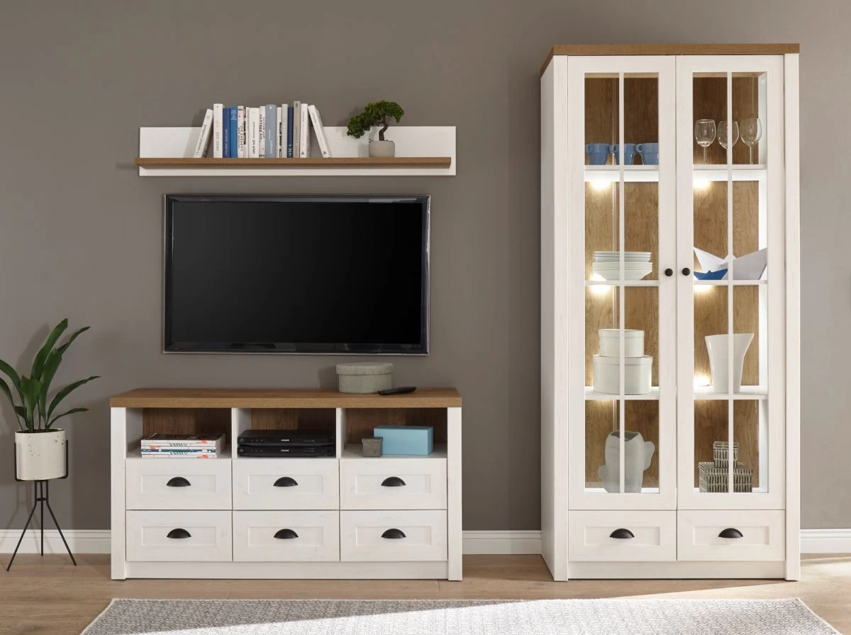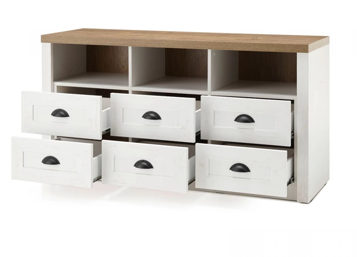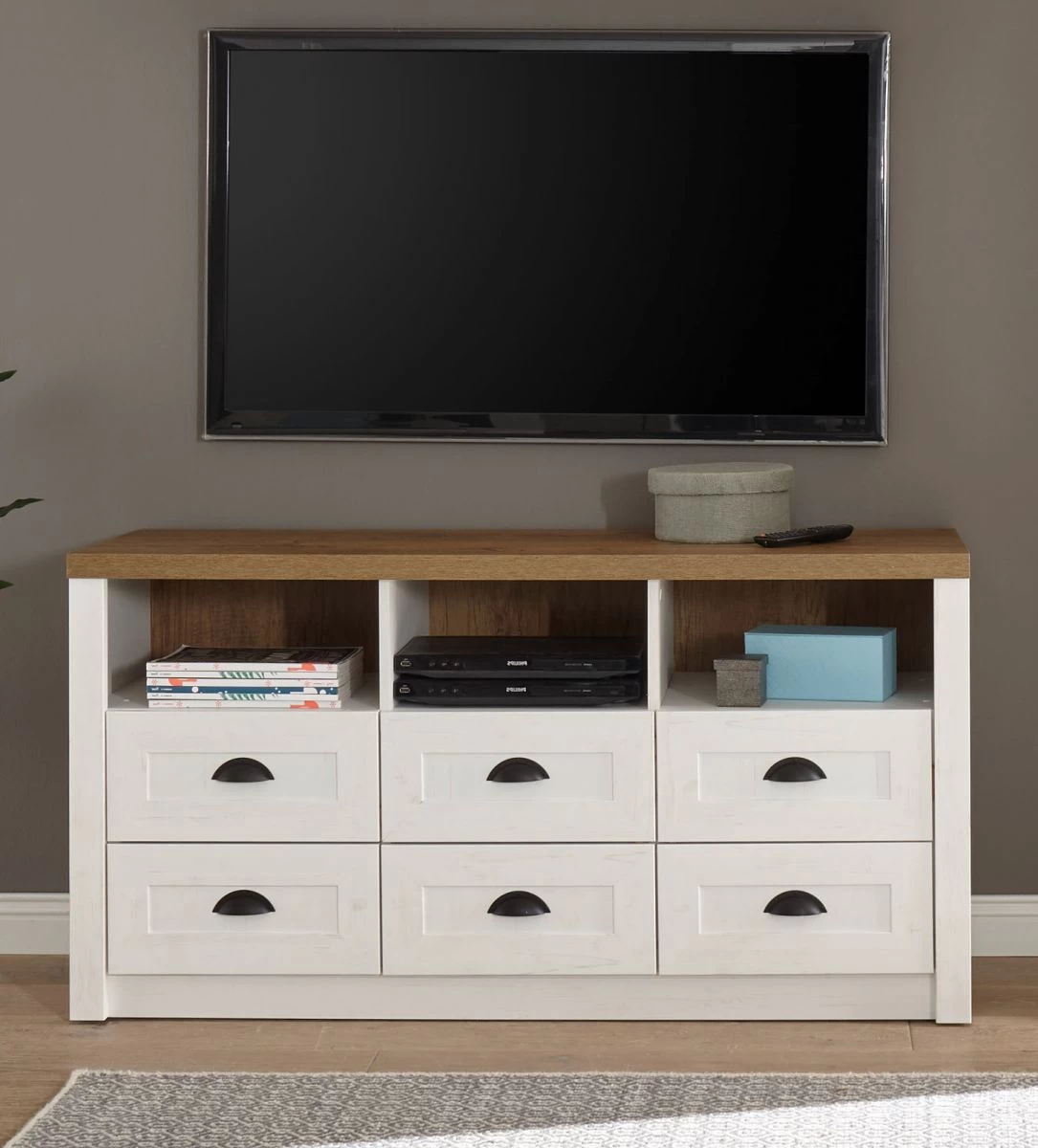 Das TV Lowboard „Seyne“ in weiß Pinie und Eiche hell (130 x 68 cm) lässt sich in viele verschiedene Einrichtungsstile und Raumkonzepte integrieren. Das Media-Möbel ist eine attraktive und funktionale Lösung für jedes Wohnzimmer. Drei offene Gerätefächer mit Kabeldurchlass sind Teil des TV Schranks. Das Modell „Seyne“ hat sechs Schubkästen zur Aufbewahrung Ihrer Medien, kann auch optisch durch sein modernes, ländliches Design überzeugen und steht mit dem FSC®-Gütesiegel für nachhaltige Forstwirtschaft. Es zeichnet sich durch seine unempfindliche Beschaffenheit aus. Das in den Dekoren Pinie weiß und Eiche hell gehaltene TV Möbel weist eine Gesamtbreite von 130 cm, eine Höhe von 68 cm und eine Tiefe von 43 cm auf. Das Modell „Seyne“ besticht mit sechs ästhetischen in Schwarz gehaltenen Griffen aus Metall und ist in weiteren Größenvarianten vorhanden. Sie werden dieses TV Lowboard im Landhausstil lieben.