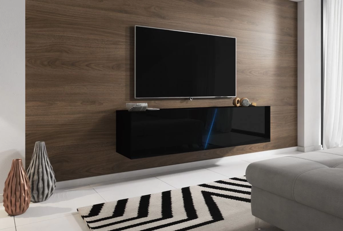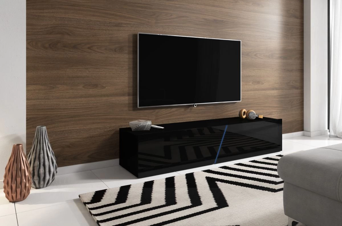 Das moderne TV Lowboard „Space“ in schwarz Hochglanz und mit einer Länge von 160 cm überzeugt durch sein auffälliges Design. Die per Fernbedienung zu betätigende LED-Beleuchtung lässt das Lowboard fast futuristisch anmuten. Bei der Beleuchtung können Sie die Farben und Farbeffekte frei wählen. Ihre Gäste werden überrascht sein.