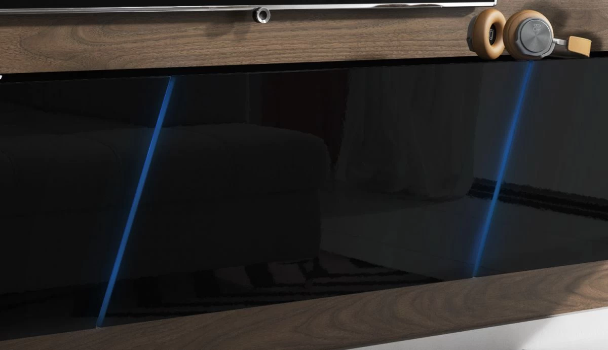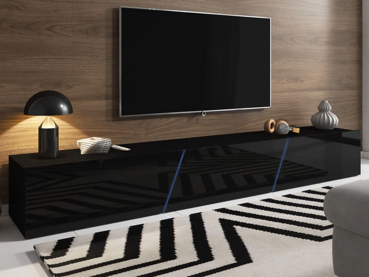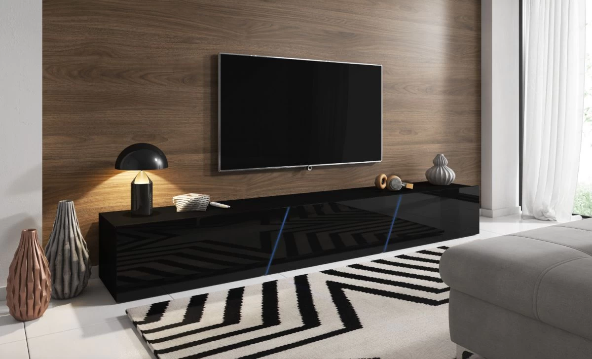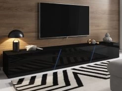 Das moderne TV Lowboard „Space“ in schwarz Hochglanz und mit einer Länge von 240 cm überzeugt durch sein sehr elegantes Design. Die mit Fernbedienung zu betätigende LED-Beleuchtung lässt das Lowboard fast futuristisch anmuten. Bei der Beleuchtung können Sie Farben und Farbeffekte frei wählen. Ihre Gäste werden überrascht sein.