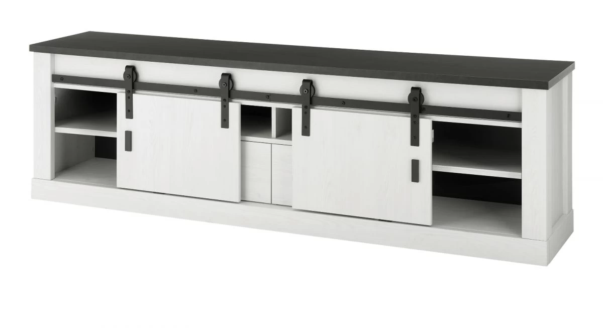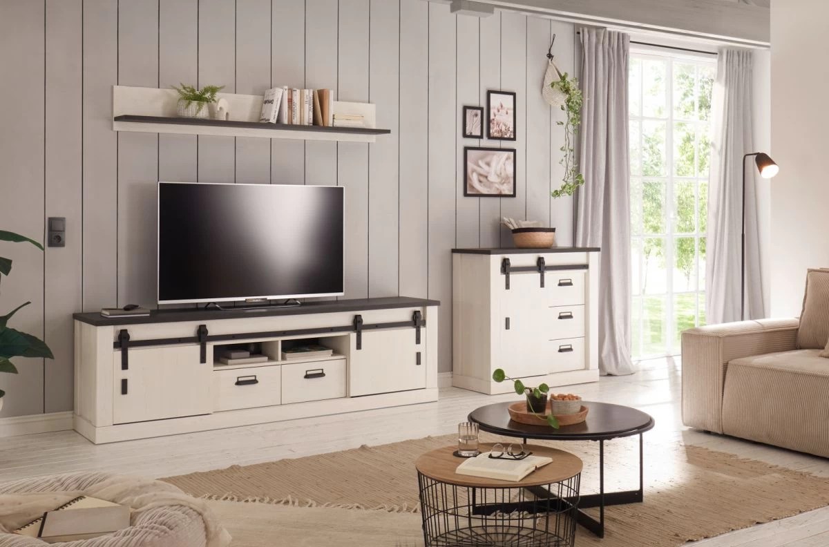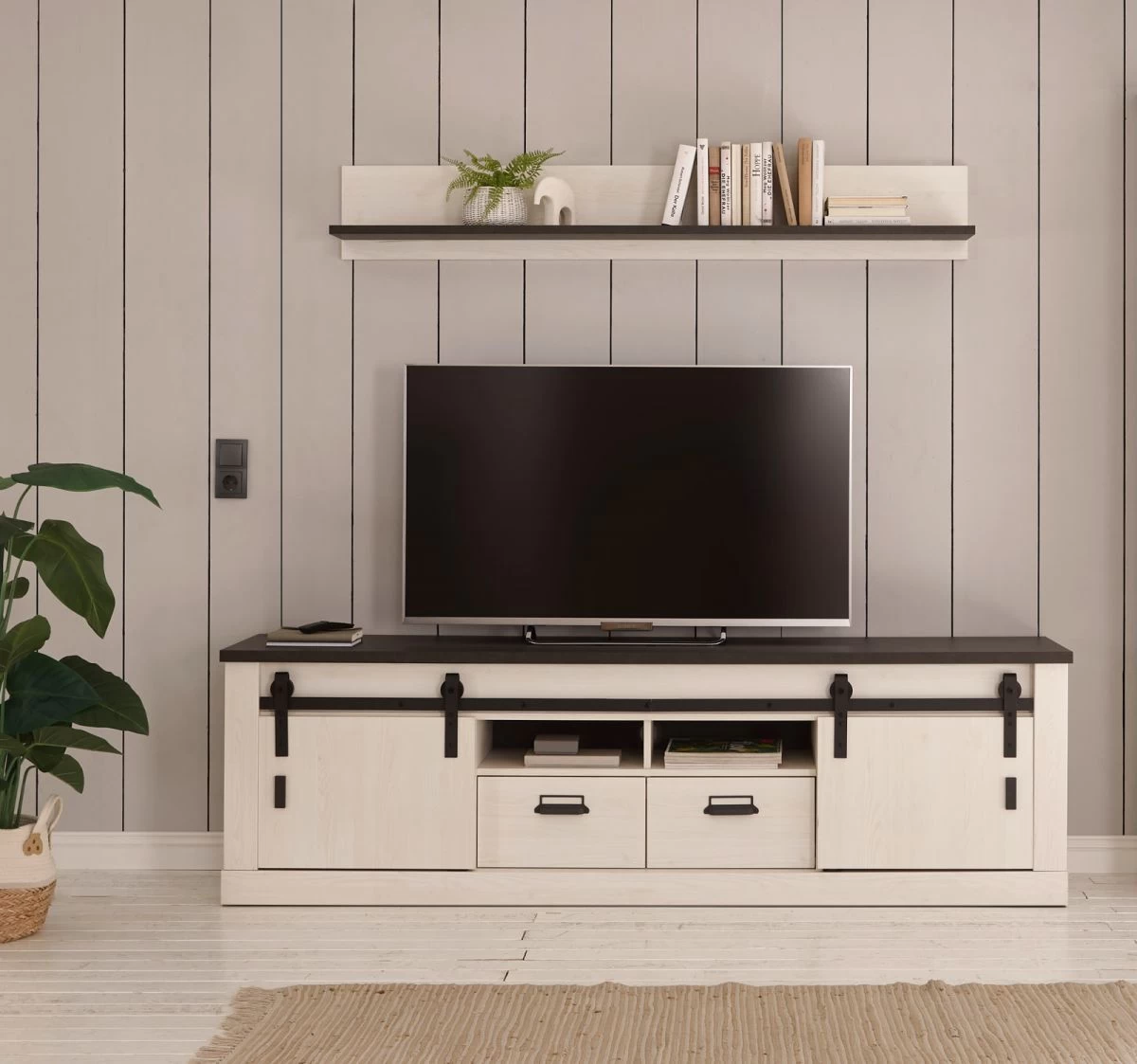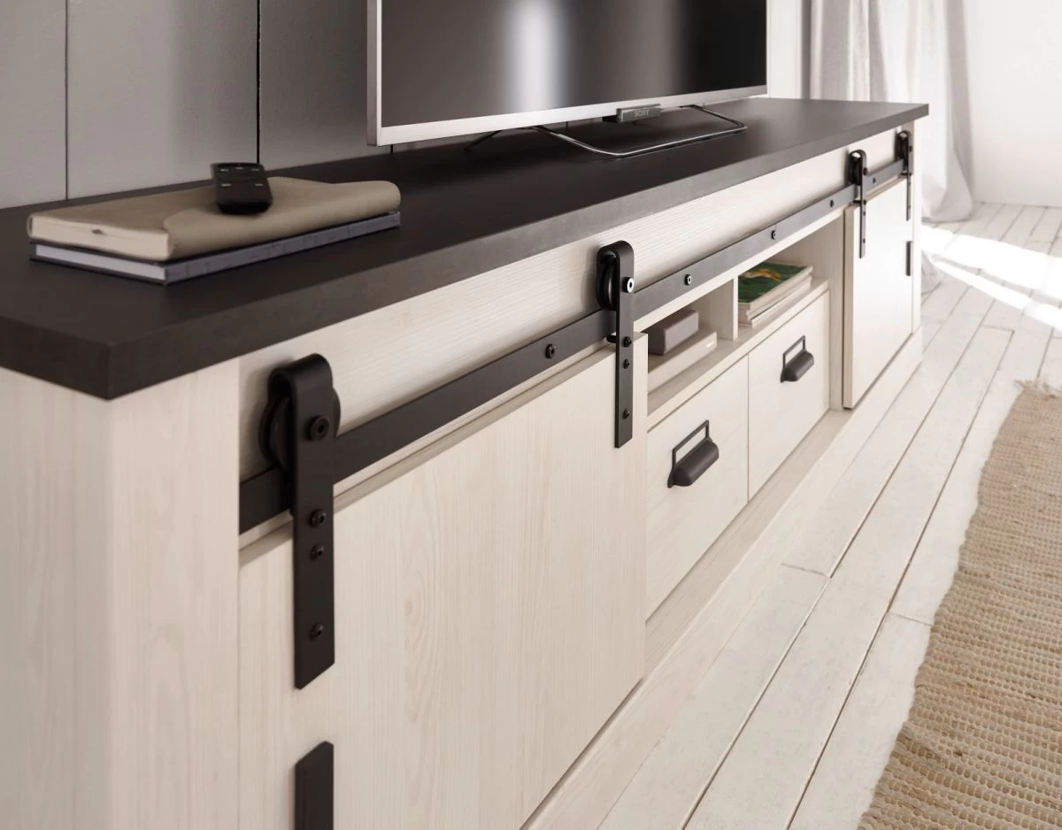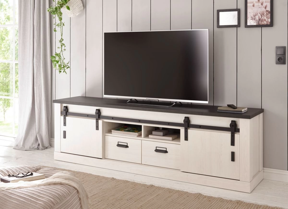 Sie werden das TV-Lowboard „Stove“ in weiß Pinie und anthrazit (201 x 61 cm) lieben. Das XL TV-Möbel findet in Ihrem Wohnzimmer einen Platz und erweitert mit 4 Fächern Ihren Stauraum. Zwei Schubladen mit Soft-Close-Funktion und dekorativen Apothekergriffen runden das Platzangebot ab. Aufgrund der Kabeldurchführung lässt es sich ideal für die Nutzung von technischen Geräten verwenden. Als besonderes Extra hat das Modell „Stove“ zwei Schiebetüren, die an einem Scheunentorbeschlag aus Metall aufgehängt sind. Das TV-Lowboard im natürlichen Landhaus Design besteht aus FSC®-zertifiziertem Material aus nachhaltig bewirtschafteten Wäldern. Das im Dekor weiß Pinie und in Anthrazit gestaltete Möbelstück zeichnet sich durch seine pflegeleichte und besonders widerstandsfähige Beschaffenheit aus. Es hat eine Breite von 201 cm, eine Gesamthöhe von 61 cm sowie eine Tiefe von 43 cm. Das Modell „Stove“ lässt sich mit vier ästhetischen schwarzen Griffen aus Metall öffnen und schließen und ist in unterschiedlichen Größenvarianten lieferbar. Dieses XL TV-Lowboard im Landhausstil ist ein absoluter Gewinn für alle Liebhaber gelungener Einrichtung.