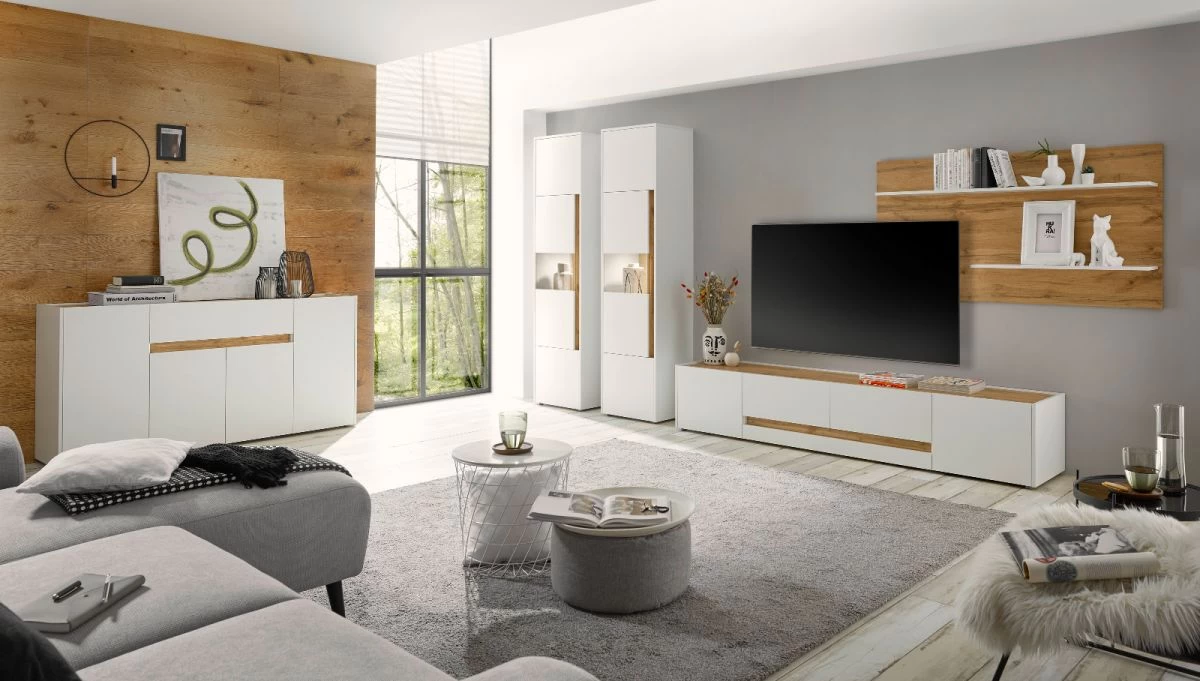 Im Vitrinenschrank „Center“ sind Gegenstände mit persönlichem Wert perfekt aufgehoben. Das Möbel ist vortrefflich für das Wohn- und Esszimmer geeignet und bietet zwei Türen. Es bringt drei Einschubebenen mit. Die Vitrine „Center“ in weiß und Wotan Eiche vervollständigt Ihr persönliches Einrichtungskonzept dank des modernen sowie eleganten Stils. Das Modell ist pflegeleicht und besonders strapazierfähig. Es präsentiert sich in der Farbe Mattweiß und besteht aus FSC-zertifiziertem Holz aus nachhaltig bewirtschafteten Wäldern. Der Korpus bietet nicht nur durch seine Form, sondern gleichsam durch seinen Überzug aus mattweißem Melamin ein attraktives Ambiente. Material der Fronten ist mattweiß. Darüber hinaus ist der Vitrinenschrank „Center“ 197 cm hoch, 50 cm breit und 40 cm tief. Mit diesem Modell erhalten Sie weiteren Stauraum für Familienfotos oder Dekoelemente. Die Vitrine „Center“ in weiß und Wotan Eiche 50 x 197 cm überzeugt außerdem dank der folgenden Eigenschaften: Die Absetzungen, Böden und Rückwand sind im Dekor Wotan Eiche gehalten. Die Türen sind links oder rechts zu befestigen und ein LED-Beleuchtungs-Set kann dazu bestellt werden.